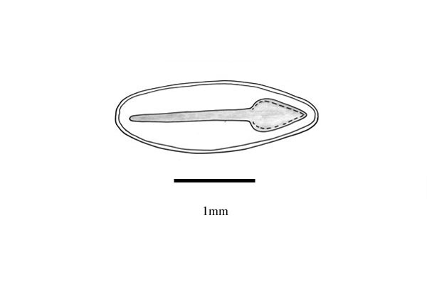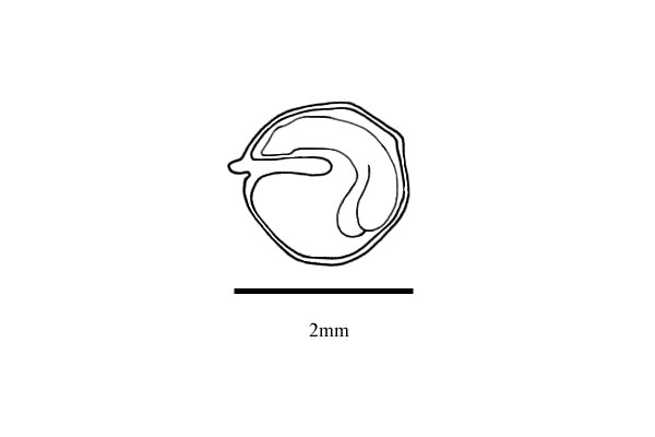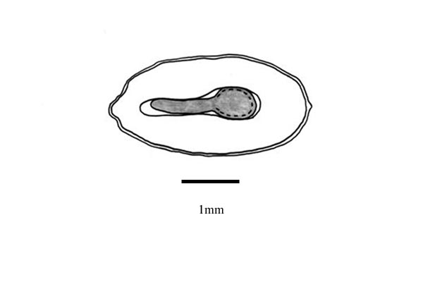 | Embryo | well developed, completely to partially filling seed coat, axileaxile: on or of the axis and centric, foliatefoliate: appearing leaf-like or conicalconical: 3D shape—cone-shaped, with the point of attachment at the broad end , straight to curvedcurved:(of embryo) linear embryo is curved into an arch or horseshoe with the ends far apart . Cotyledons spatulatespatulate:2D shape—like a spatula; rounded at the apex, with base long and tapered; (of embryo) embryo is straight and axile and centric with the cotyledons expanded to form the shape of a spatula or spoon; (of cotyledons) cotyledons expanded and wider than the stalk but not invested into the stalk or investinginvesting:(of embryo) embryo is nearly or completely filling seed coat, straight, and axile and centric with spatulate cotyledons and covering the stalk for at least half its length; (of cotyledons) cotyledons spatulate and covering the stalk for at least half its length , 0.1 to 0.9 times the length of embryo, thin, foliaceous or not, flat or convoluted, oblongoblong: 2D shape—much longer than broad with nearly parallel sides, corners are rounded , ovateovate:2D shape—egg-shaped in outline, widest point is towards one end of the organ, the other end tapers gradually, attachment at or near the broad end (compare obovate, ovoid) , cordatecordate:2D shape—heart-shaped, with attachment at or near the broad end (compare obcordate) , or orbicularorbicular:2D shape—circular in outline, 3D shape—globose . |
