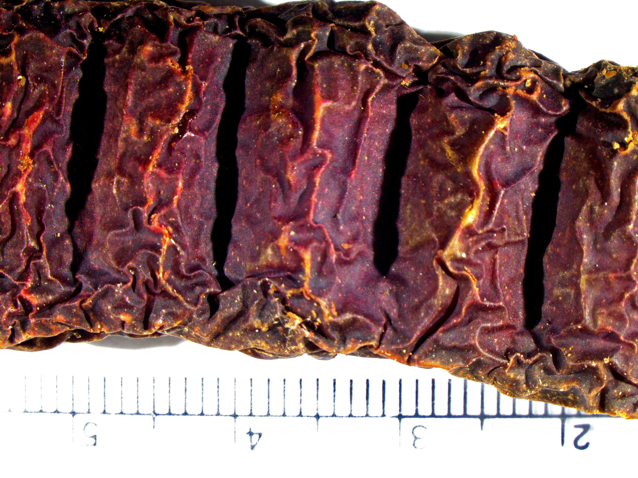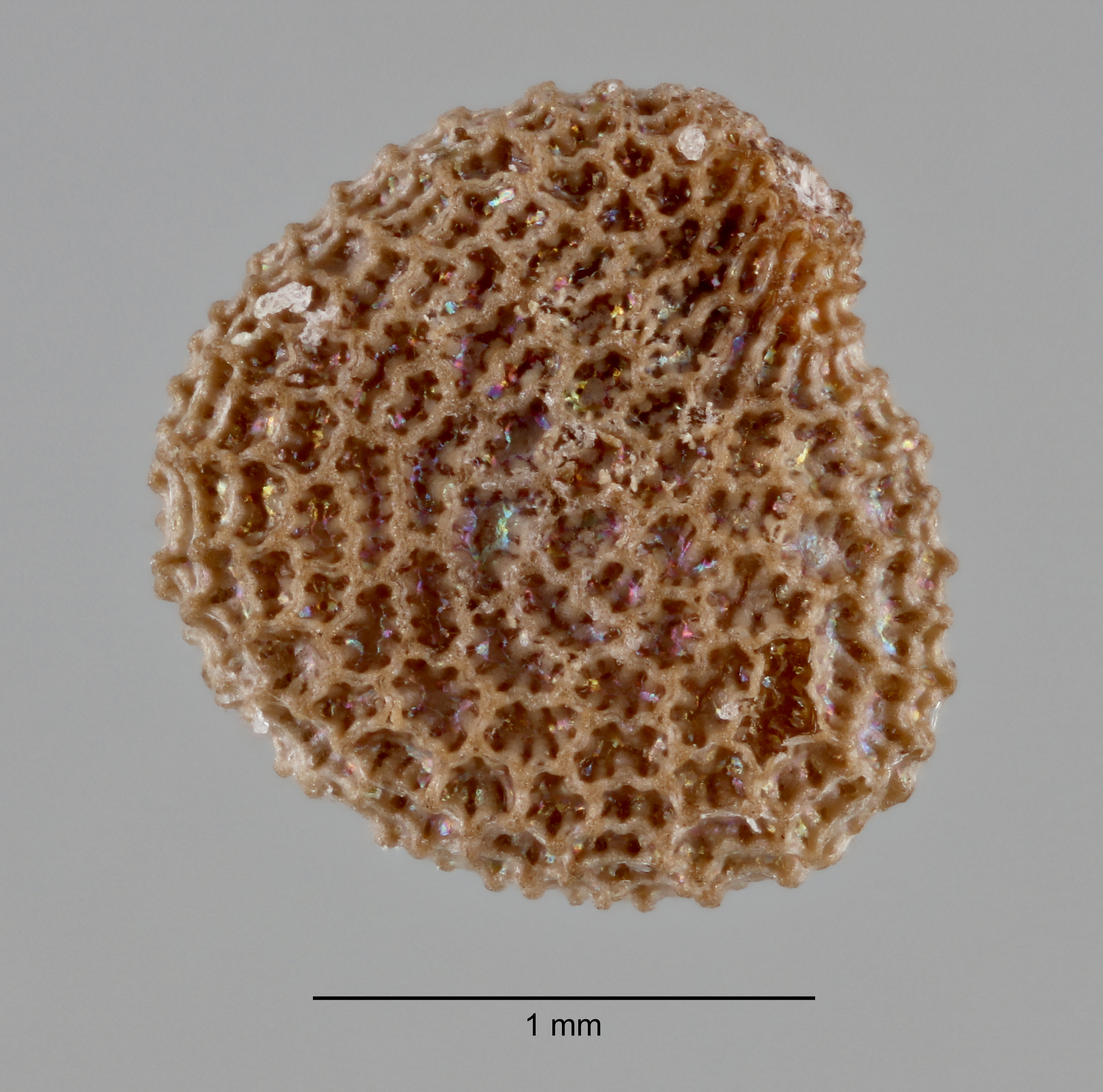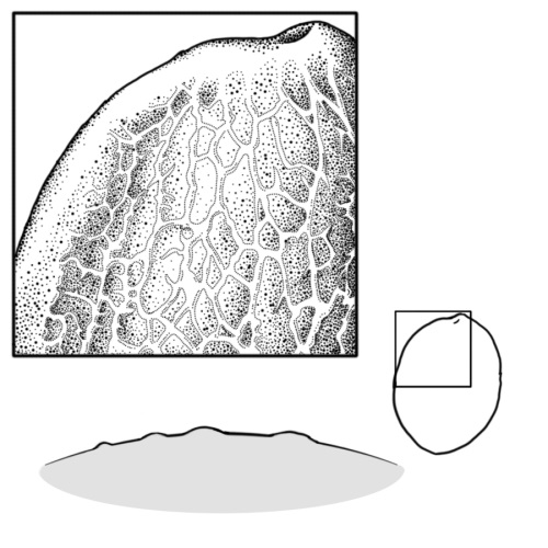 surface relief—reticulated, honeycombed; ridges that intersect to form polygonal cells with a regular size and shape similar to a honeycomb