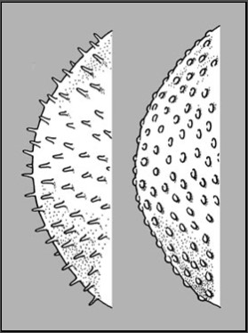 surface relief—bearing minute, distinct, broad-based projections, tapering to a rounded apex
