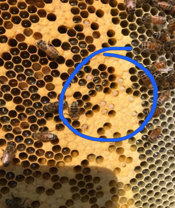 cells opened and pupae showing evidence of being removed and eaten. Imbalance of brood from the normal ratio of roughly 1 egg to 2 larvae to 4 capped brood is evidence that larvae are not being properly fed.