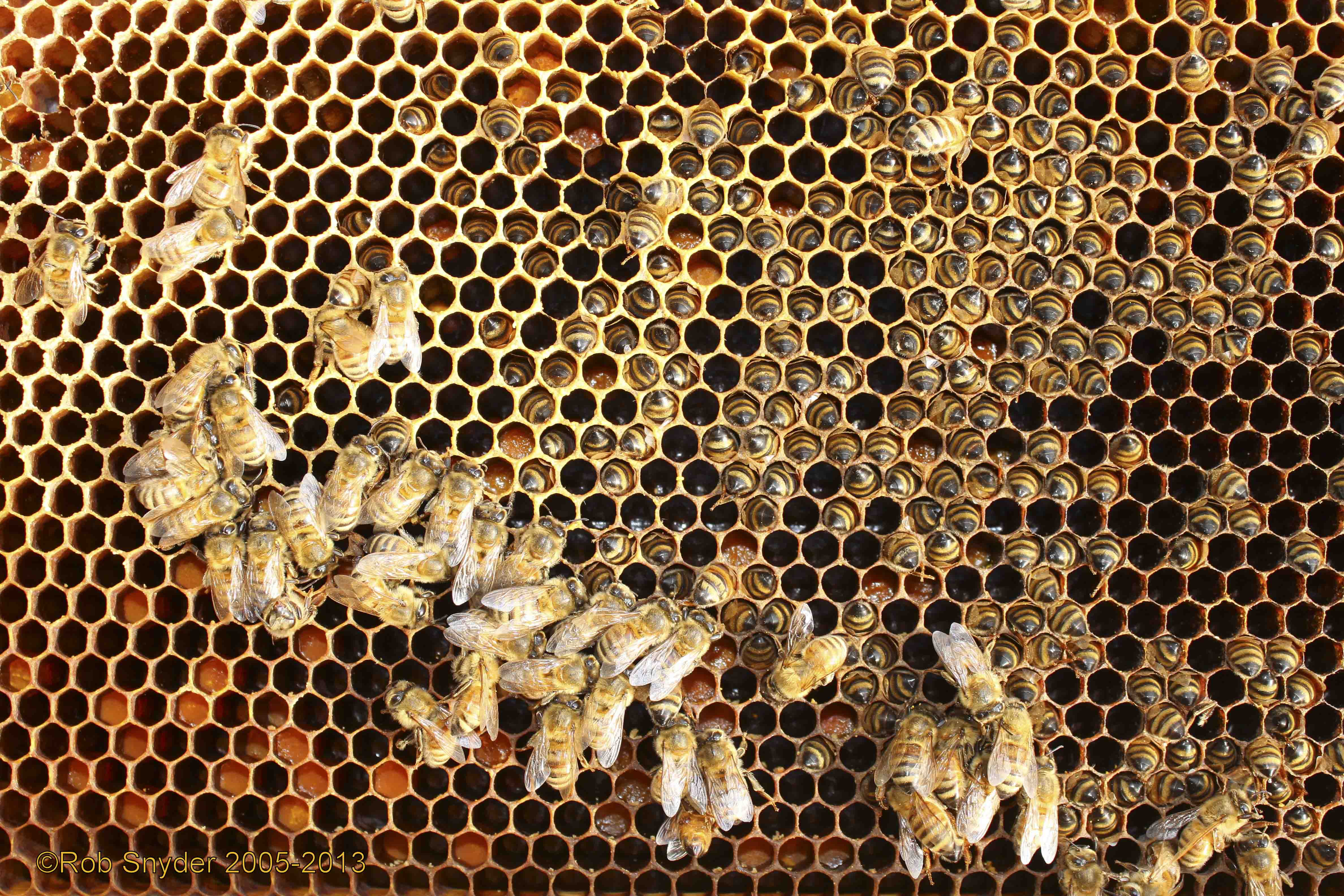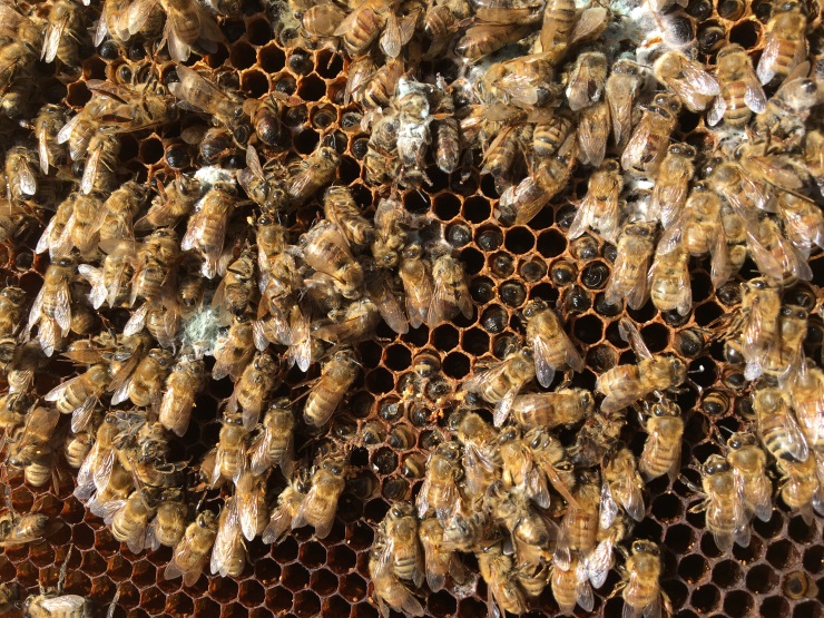 Deadout: dead bees with their heads in cells (most bees in outer cluster were removed); photo by The BeeMD photo collection