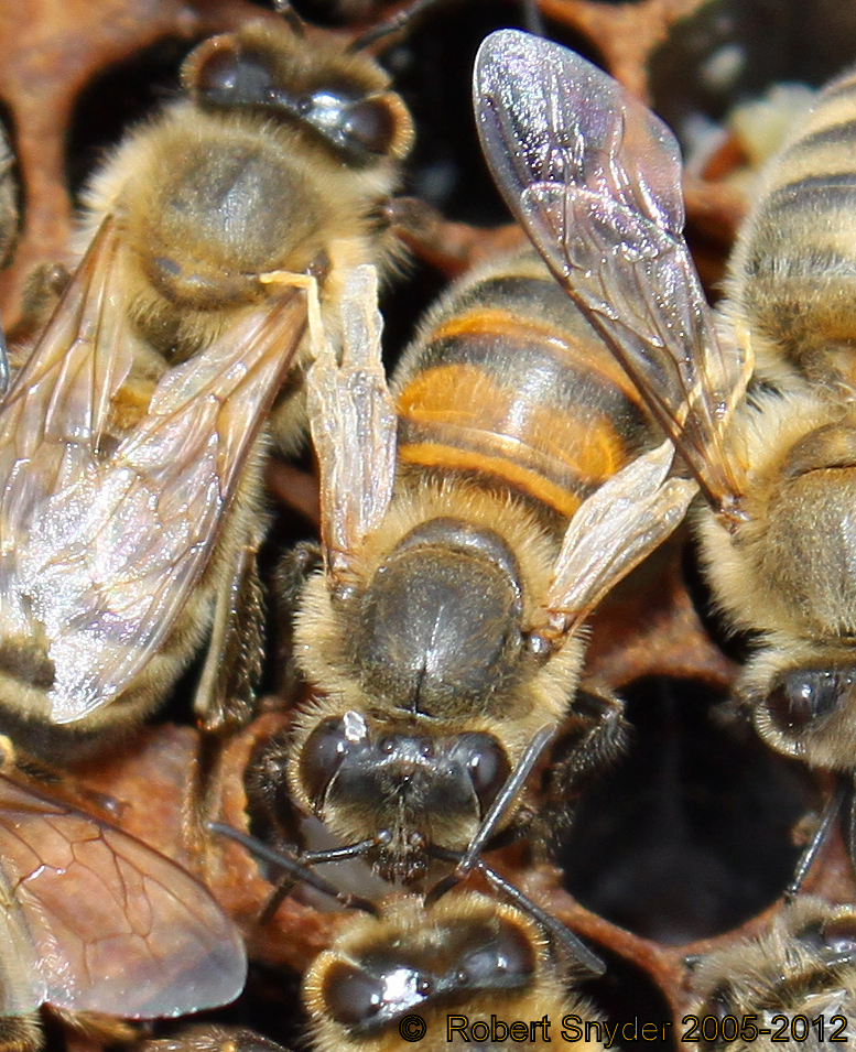 Deformed wing virus (DWV)-infected larvae may emerge as adults with deformed wings that have not expanded and are twisted, tattered, and non-functional. Immatures with DWV infections show no signs of it. Viral testing using genetic markers confirm infections.