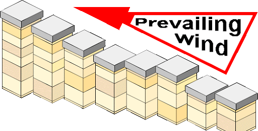 Drifting is common when colonies are all alike: same paint scheme, same orientation, same equipment, or kept close together, etc. Colonies at the end of a row frequently benefit from drifting, accumulating more foragers compared to those within a row. Prevailing winds will mean drifting happens downwind. When colonies are in rows, colonies in the front row will benefit from drift. Drift may be especially obvious if different colonies in the same apiaryapiary: