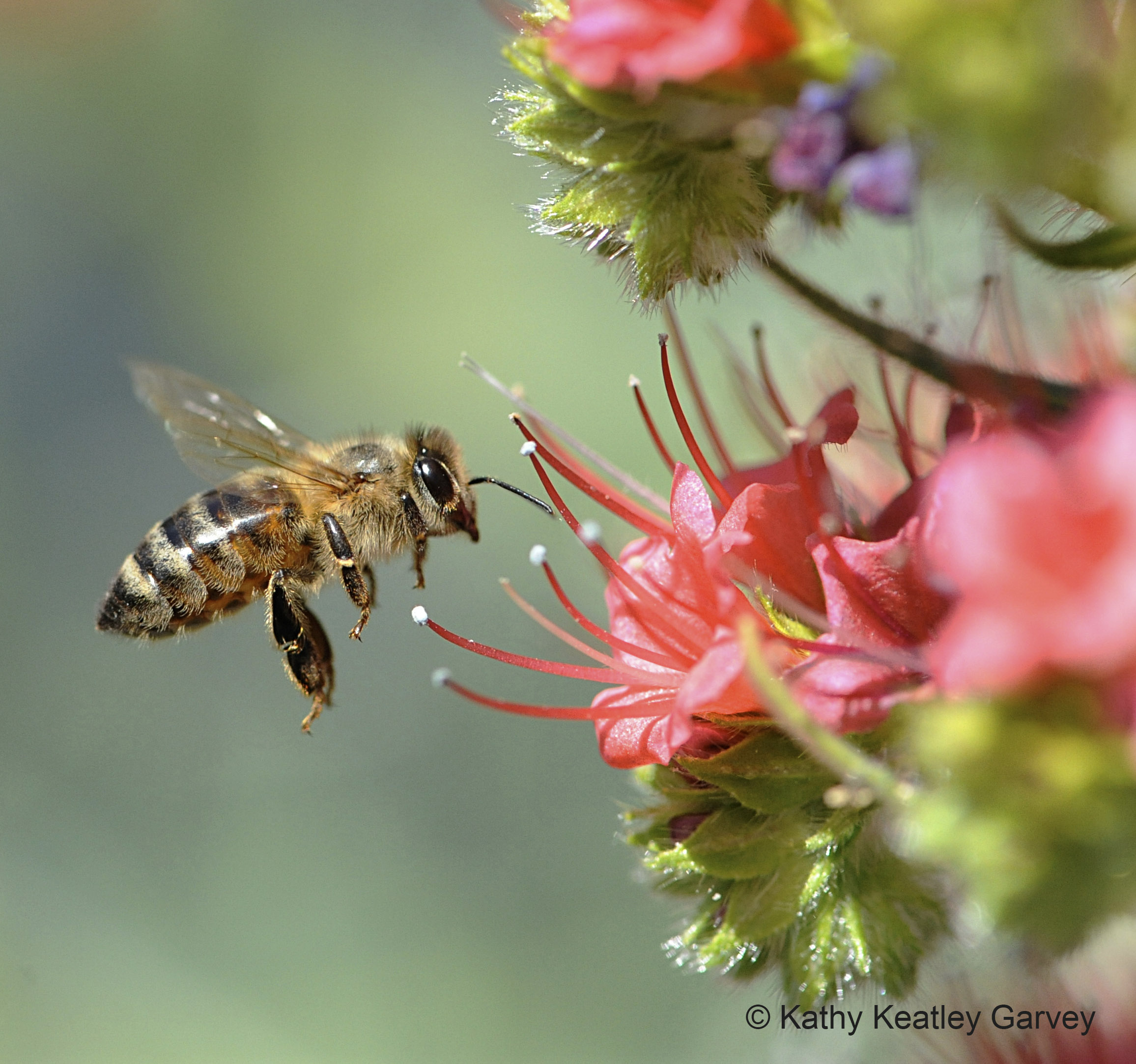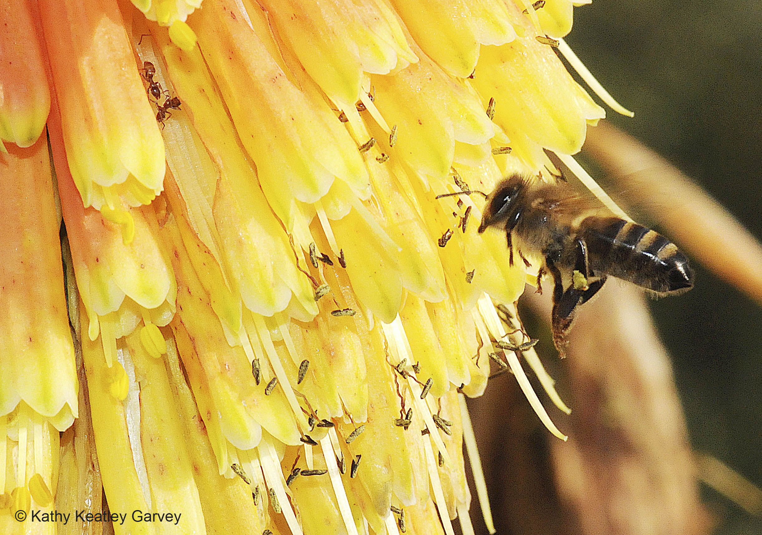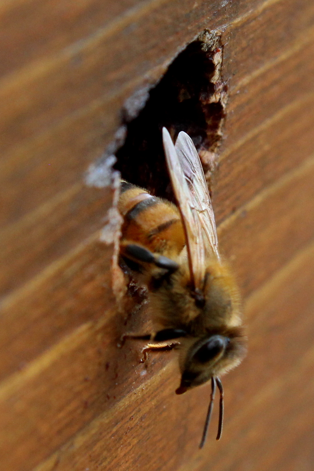 Bees leaving or entering the colony. Pollen foragers may have pollen in their hind leg pollen baskets or pollen on their body, possibly indicated by color streaks on head or thoraxthorax: