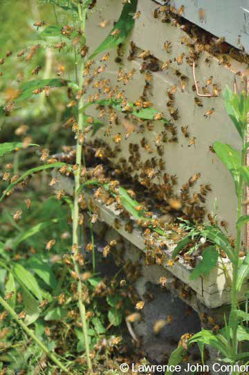 Heavily laden foragers may land in the grass, on the ground, on the sides of their hives, or on other structures on their return to the hive. This may also occur when entrance foraging traffic is especially heavy. Watching the entrance, it is possible to distinguish foraging flight to or from the colony entrance from worker orientation flights or drone flights in afternoons for mating. Robbing flight entrance also differs but is sometimes hard to distinguish form normal foraging.
