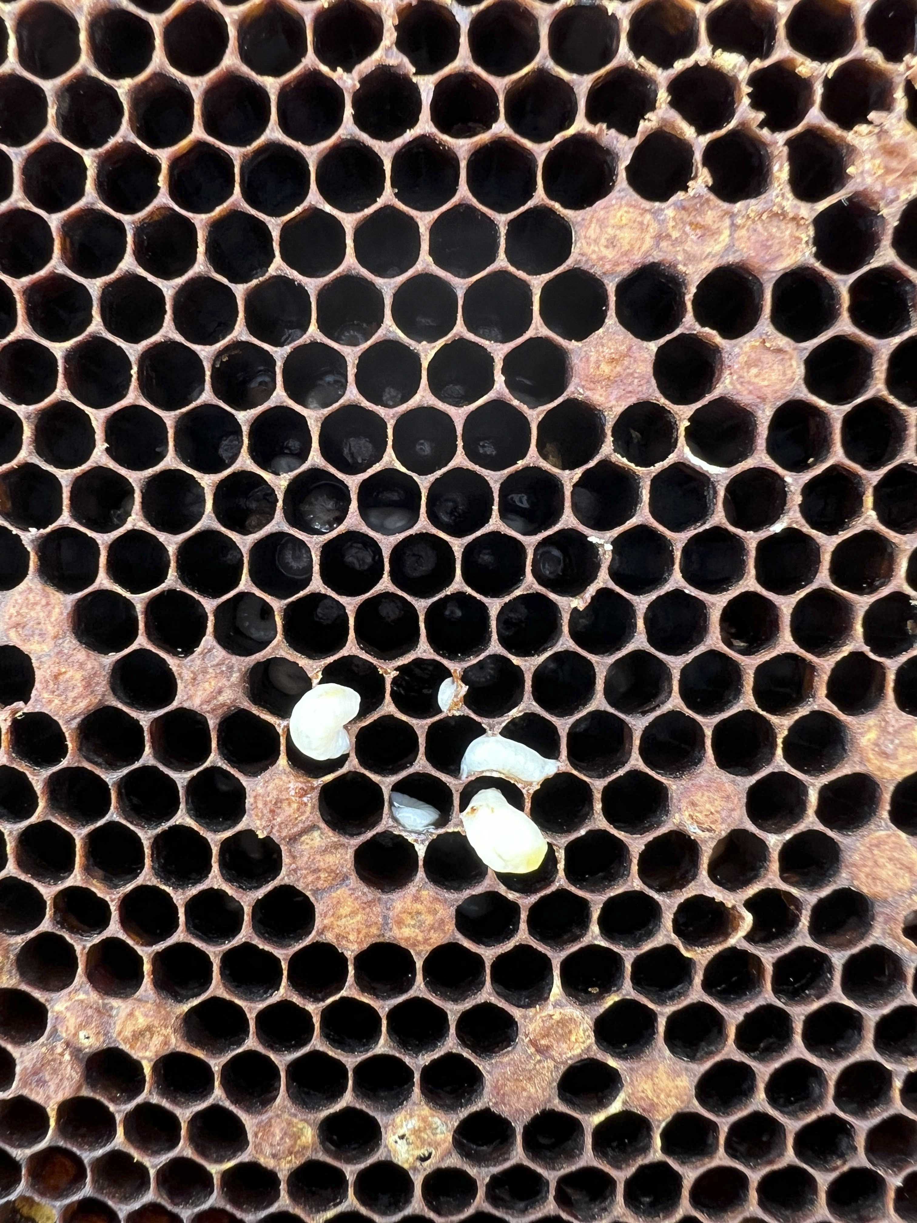 Bees may fail to keep honey stores intact during heat stress with fermentation or honey bubbling evident and/or honey may run from cells.