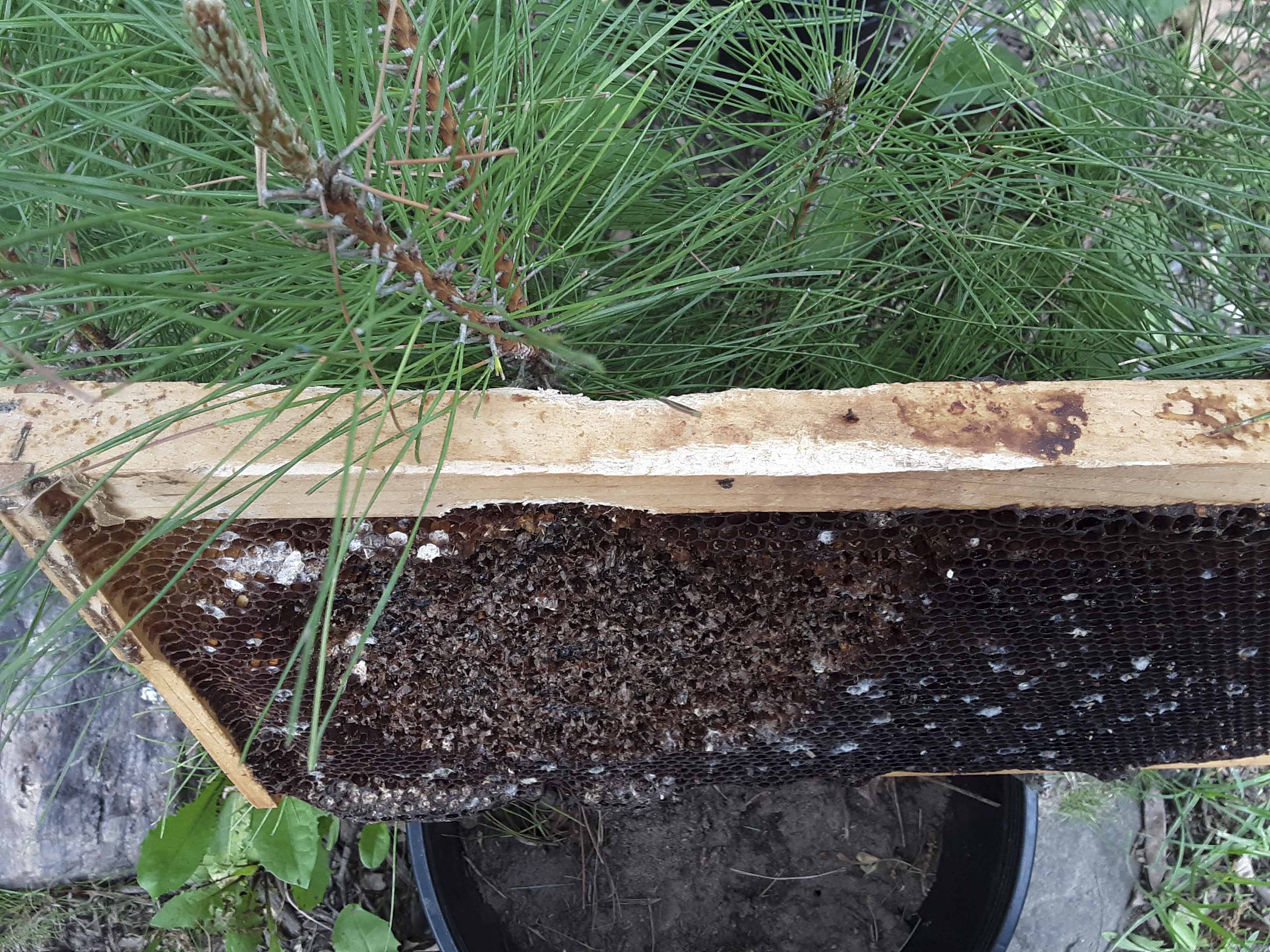 , often in the lowest brood box. Nesting mice will chew comb and wooden frames and urinate on comb and hive parts.