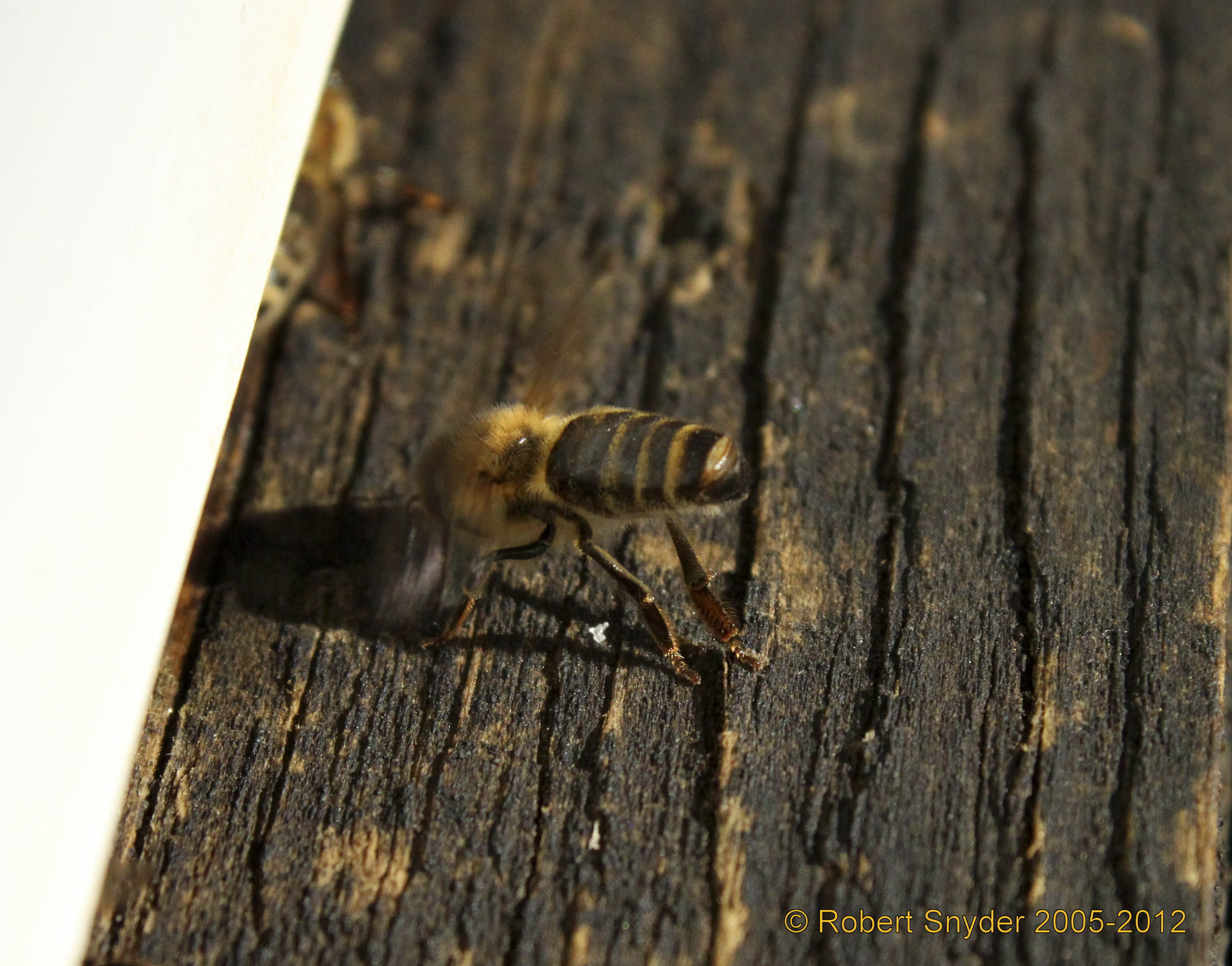 Bees standing high on hind legs with wings fanning and with tip of abdomenabdomen: