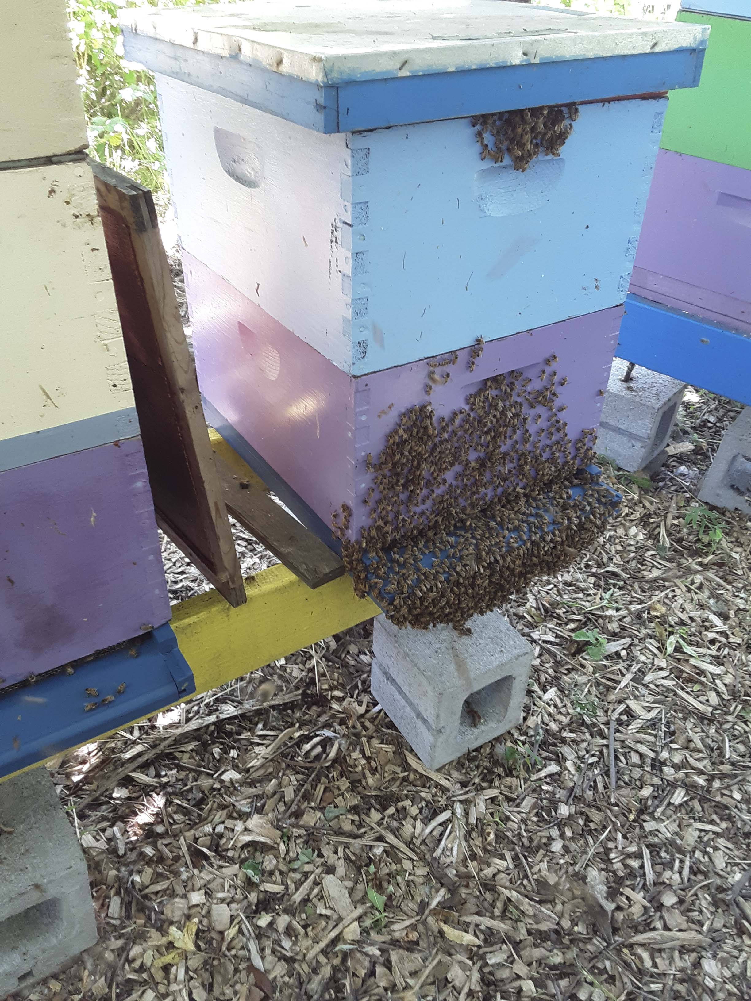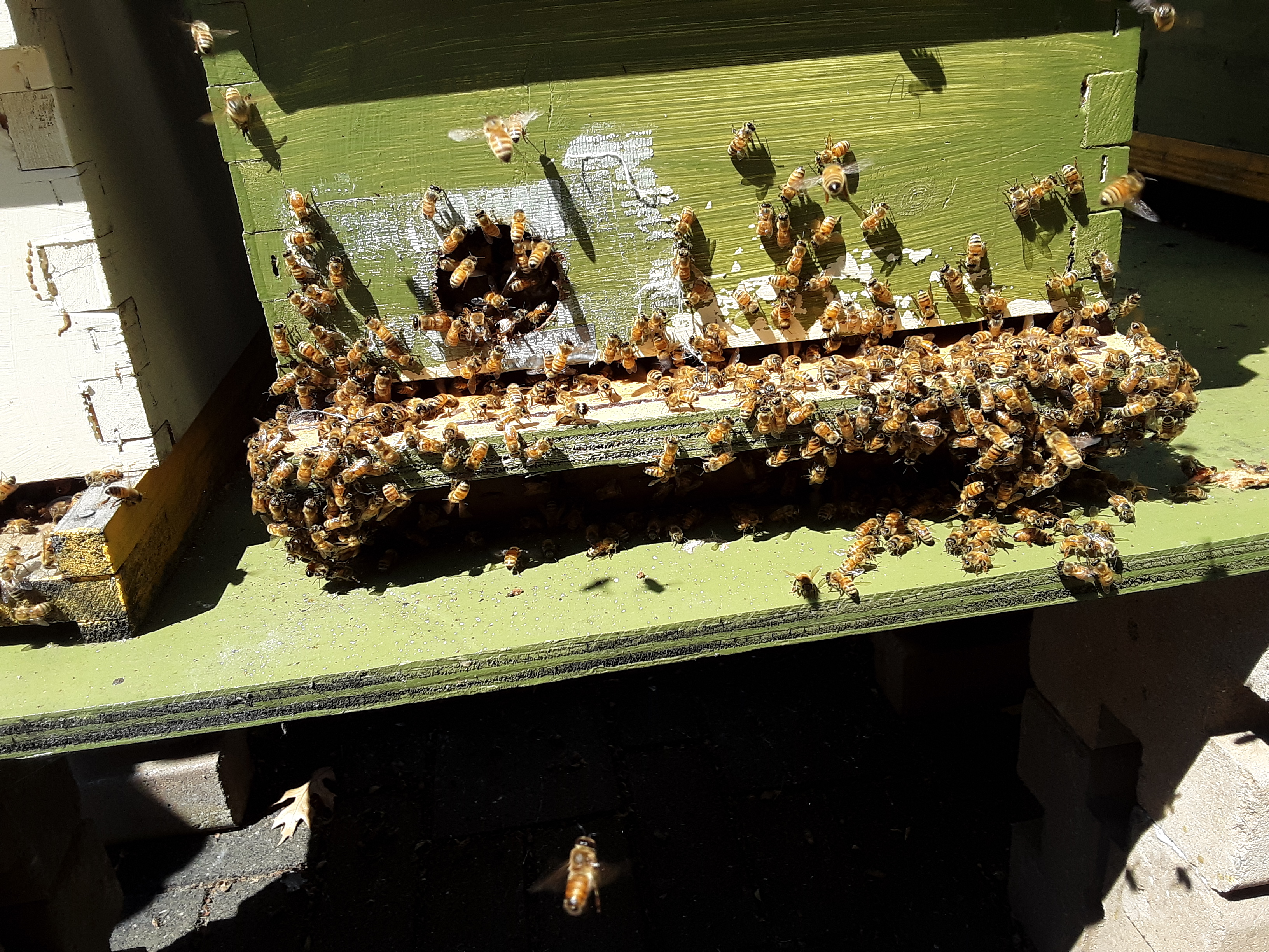 Bees may exit their hive in the hottest part of the day to beard on the outside of the colony or beneath the bottom board.