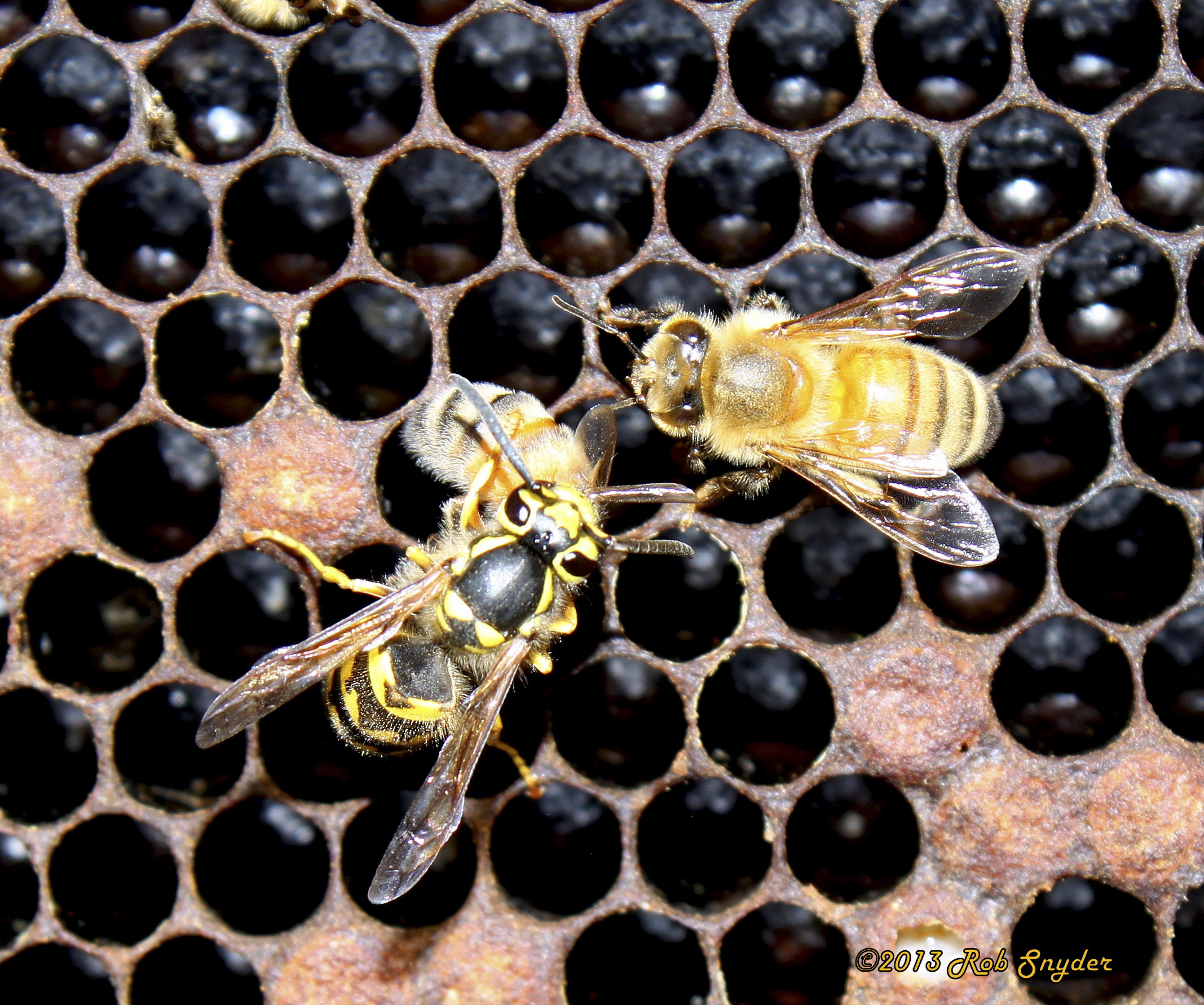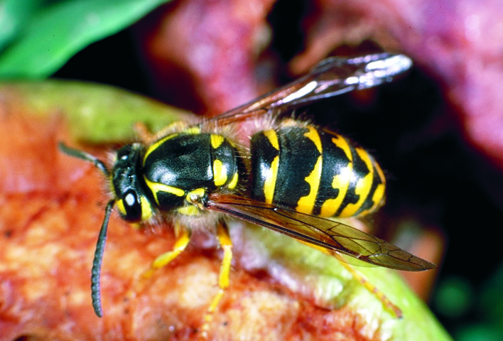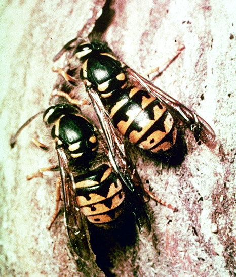 Black and yellow yellowjacket wasps that resemble bees, scavenging on dead honey bees at colony entrance; sometimes capturing live bees; entering colony (when opened) to steal honey. Weak colonies most vulnerable to attack.