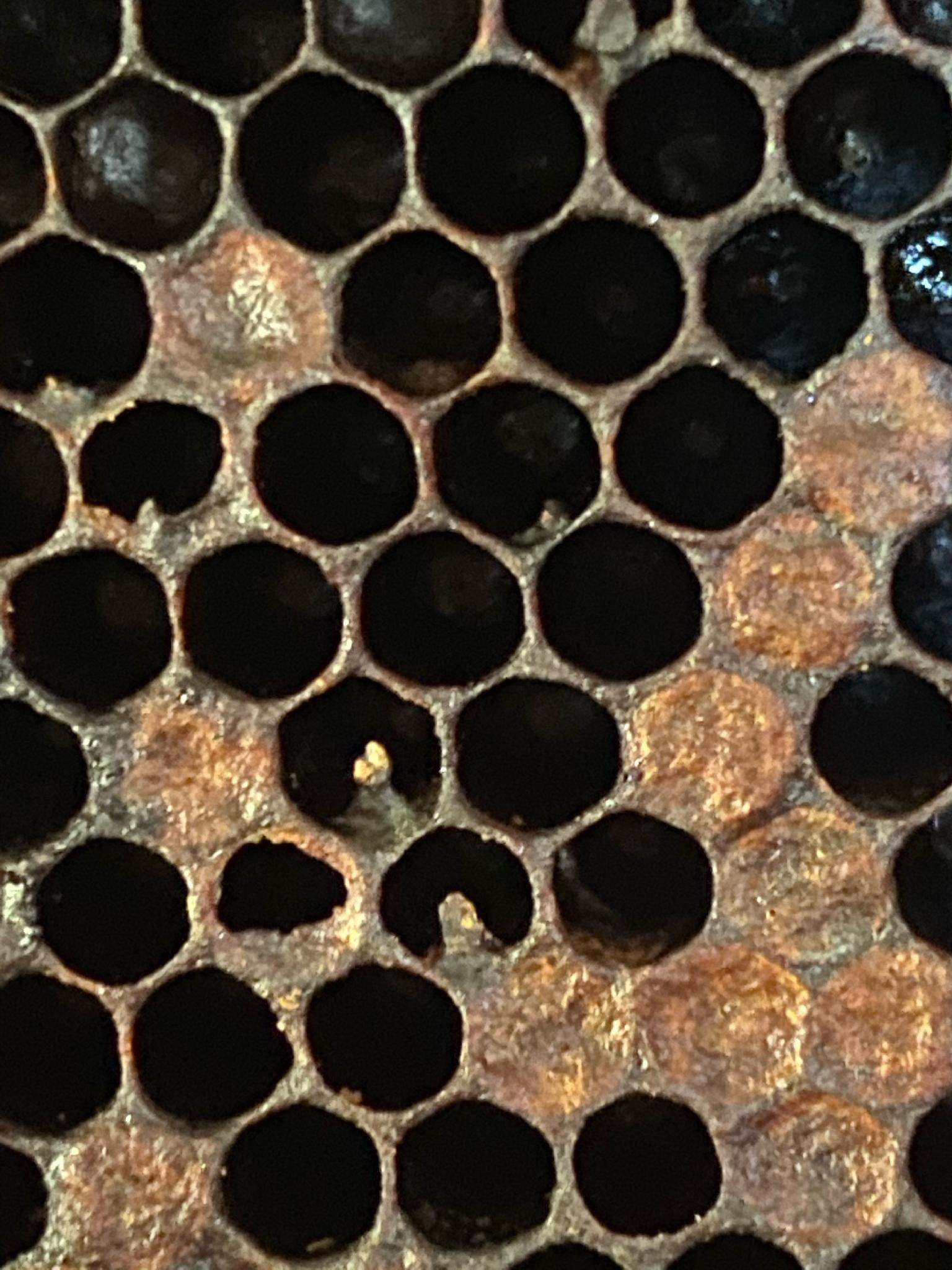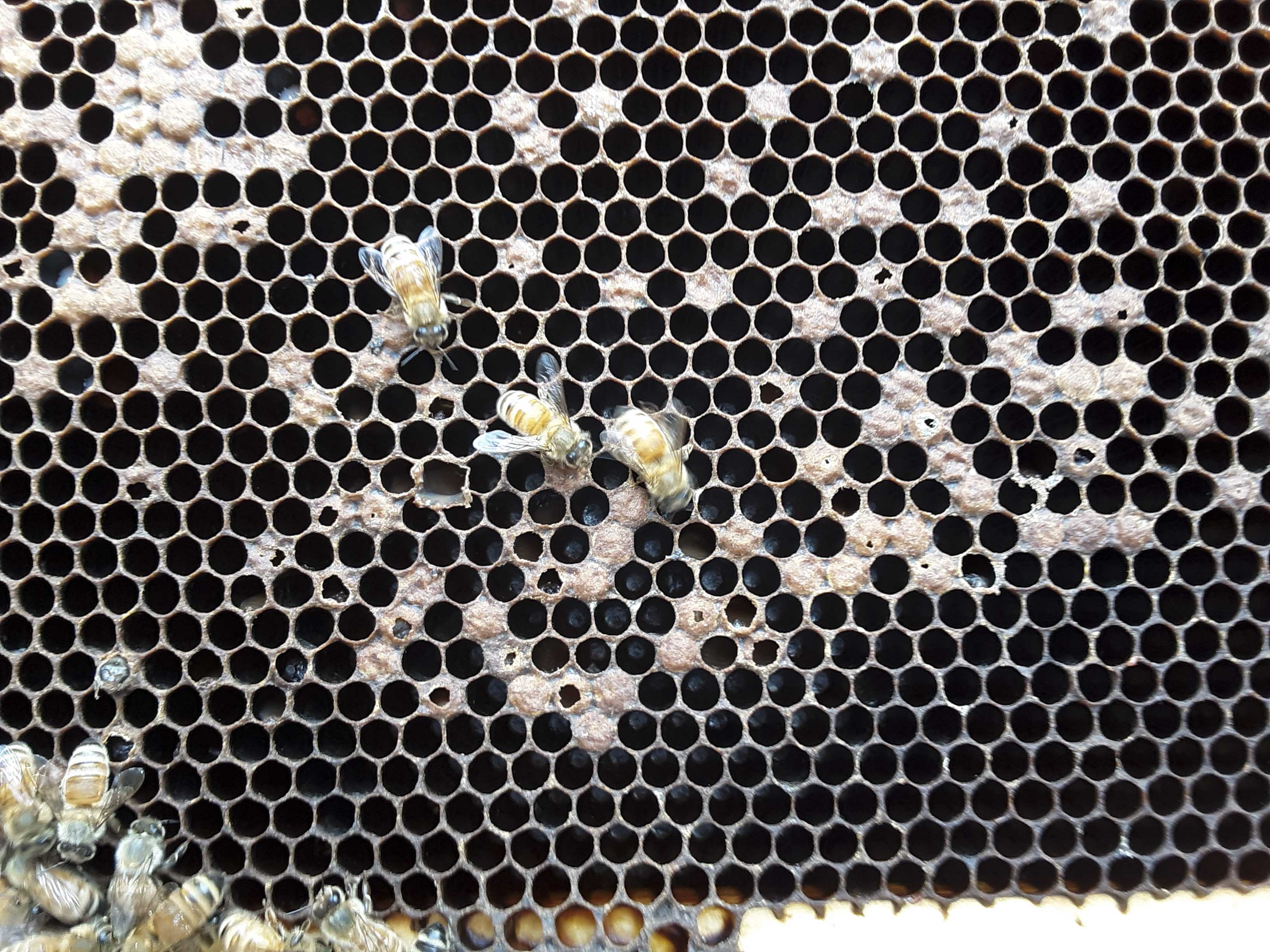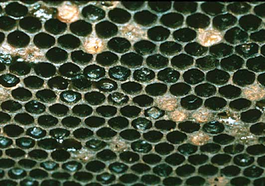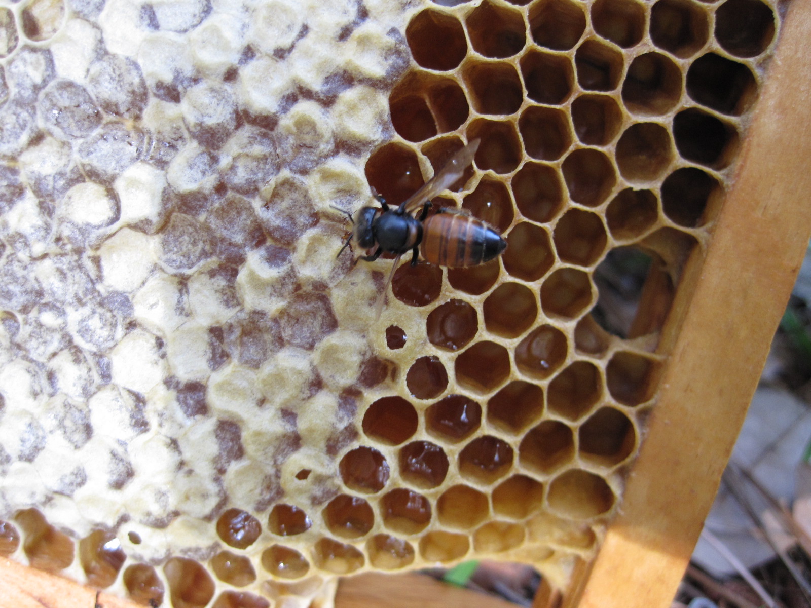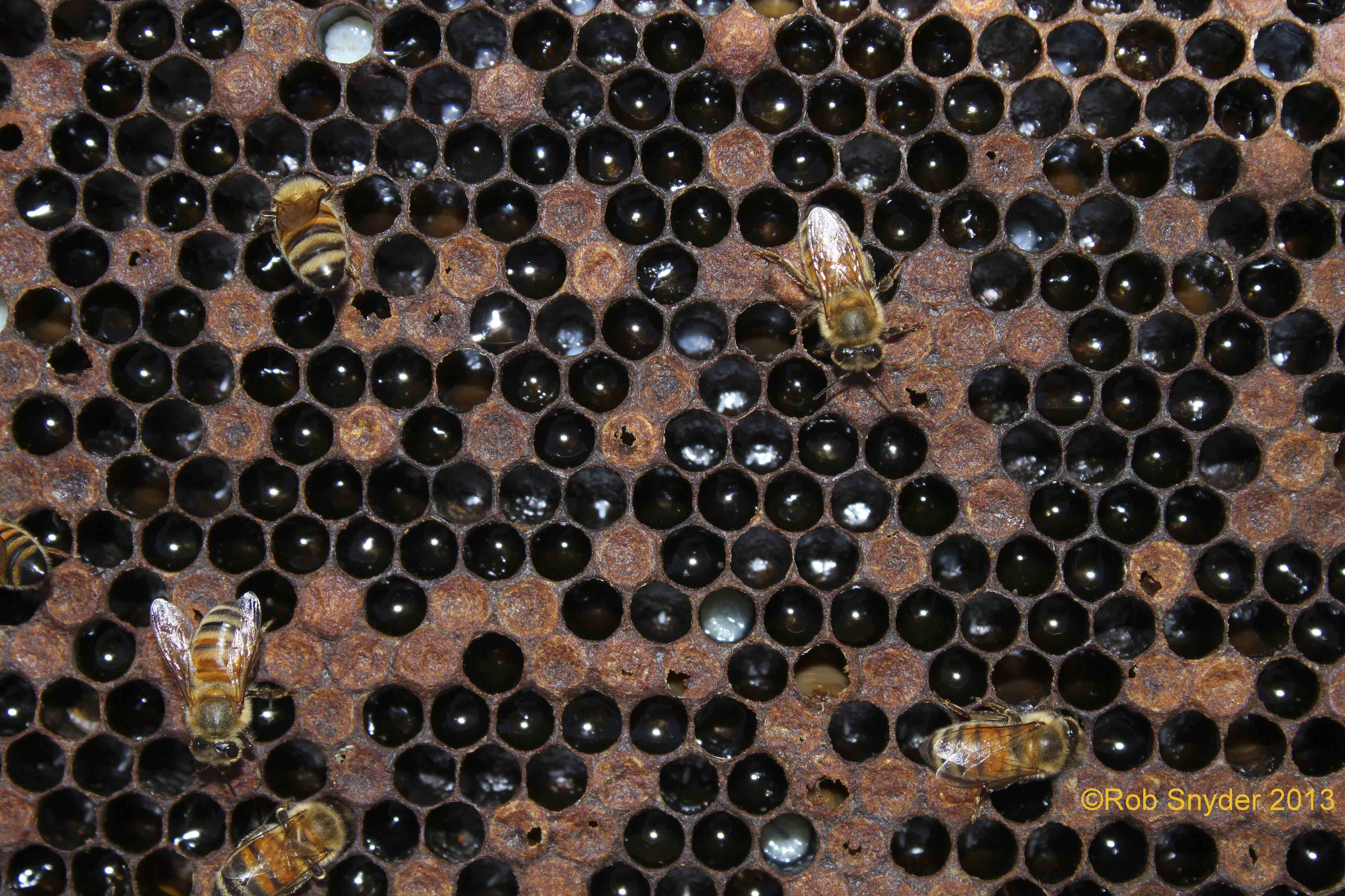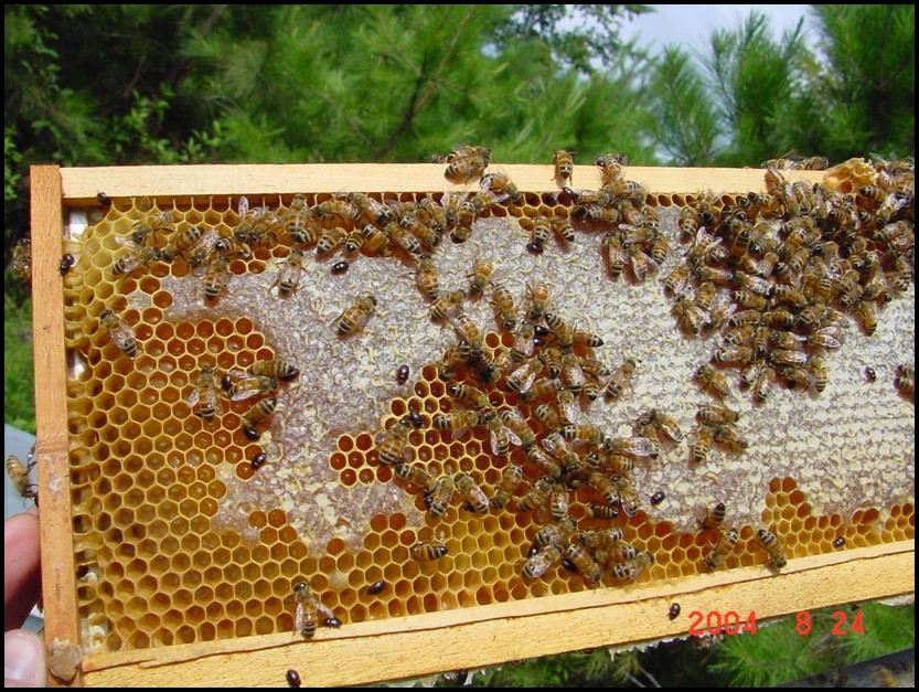 Apparent low adult population to adequately ripen honey; small hive beetles, which also appear in the photo, could be the reason for the reduced adult presence; photo by Jennifer Berry, bugwood.org