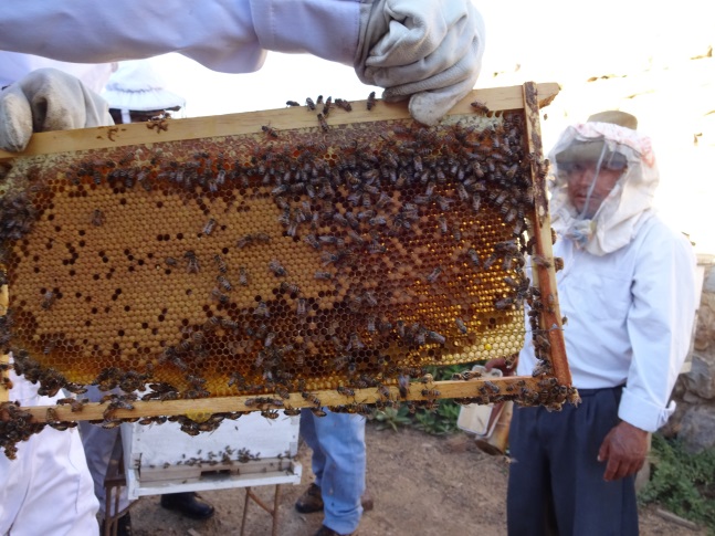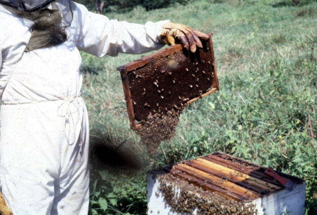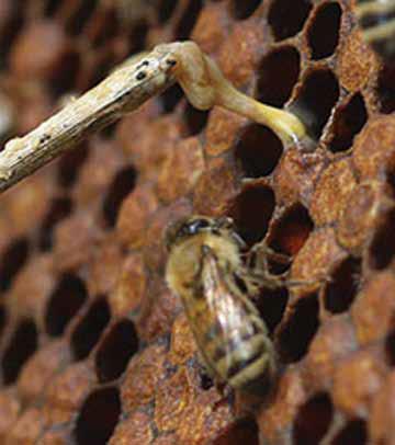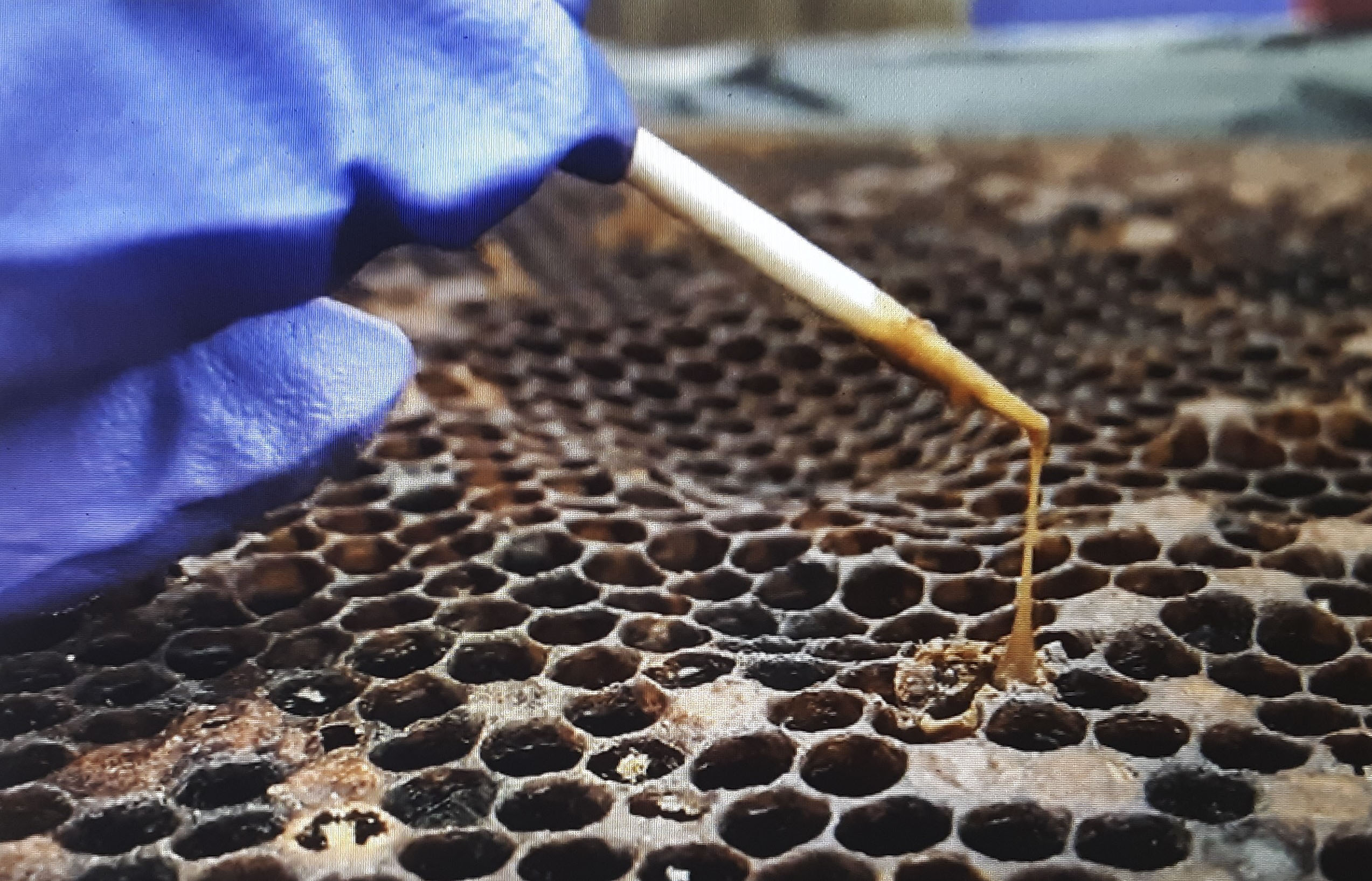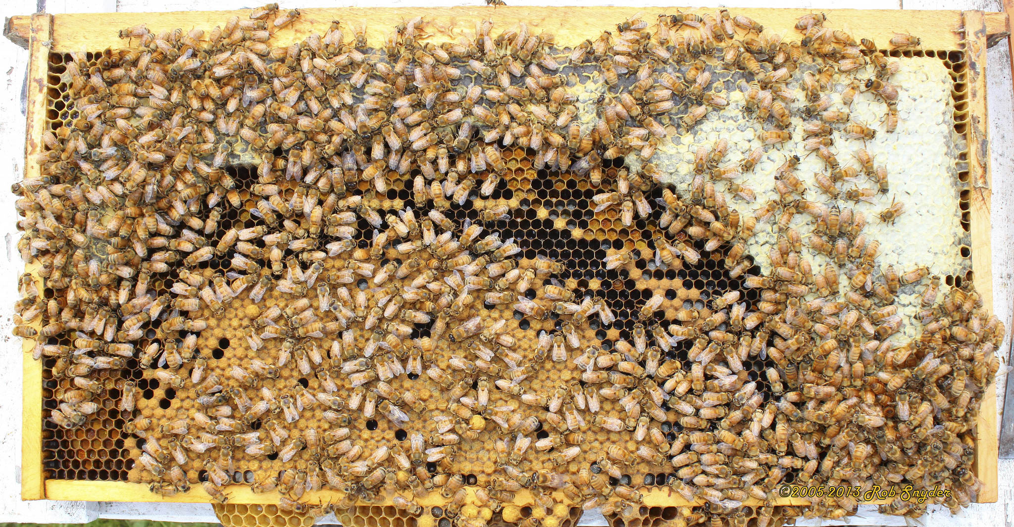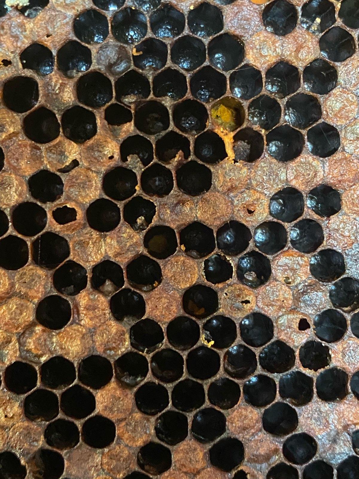 Apparent low adult population to adequately ripen honey; small hive beetles, which also appear in the photo, could be the reason for the reduced adult presence; photo by Jennifer Berry, bugwood.org
