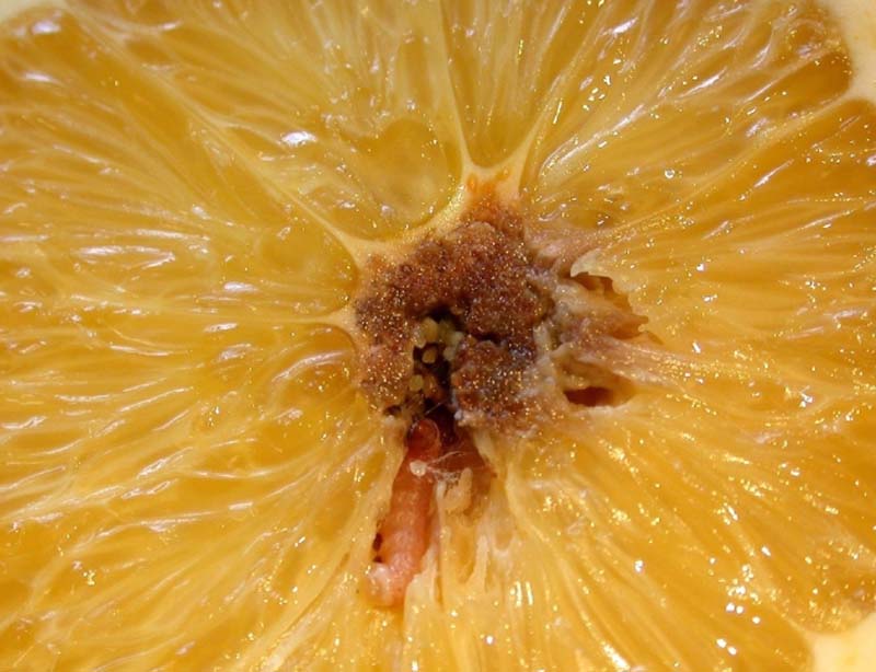false codling moth larva in citrus fruit; photo by J.H. Hofmeyr, Citrus Research International, South Africa, www.bugwood.org