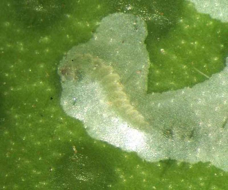 Lepidopteran larvae feed primarily on the leaves of their host plants. They may exhibit a preference for new growth flushes. Visible damage differs depending on the lepidopteran species. They may feed on the lower leaf surface, chew large holes completely through the leaves, or skeletonize the leaves with only the leaf veins remaining. In the case of mining lepidopterans, the larvae produce tunnels beneath the epidermis that can result in deformation, yellowing (chlorosis), or leaf drop.