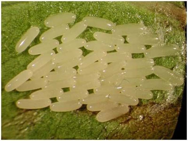 The female deposits a single layer of eggs in clusters of 30 - 260 eggs between two leaves or inside the folded edge of a leaf. The female weevil secretes a thick, gelatinous substance that glues the leaf edges together.