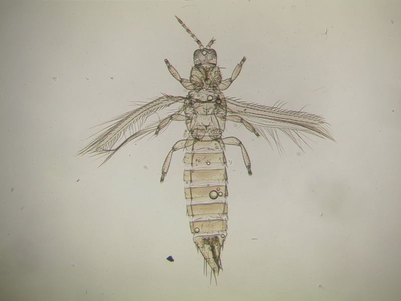 There are more than 160 species listed in the genus Frankliniella which can make correct identification difficult and require microscopic examination. For example, Florida flower thrips, Frankliniella bispinosa can only be differentiated from the Caribbean species, F. cephalica visually by the shape of the pedicelpedicel: