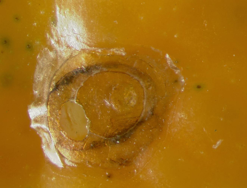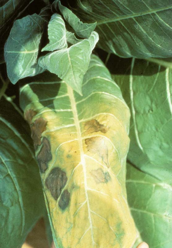 brown marmorated stink bug damage to tobacco leaf; photo courtesy of R.J. Reynolds Tobacco Company, www.bugwood.org