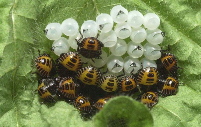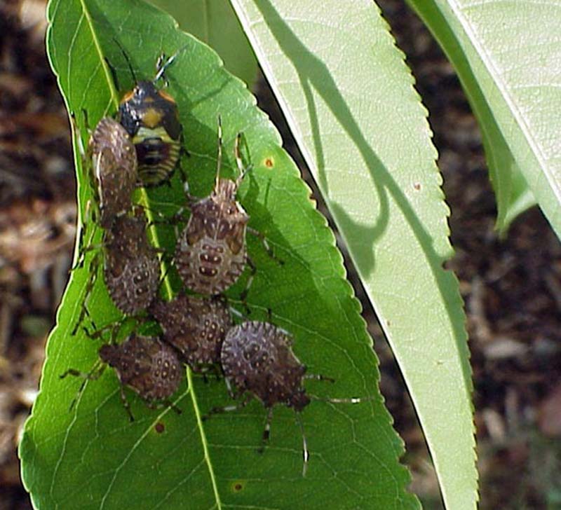 brown marmorated stink bug eggs and nymphs; photo by David R. Lance, USDA APHIS PPQ, www.bugwood.org