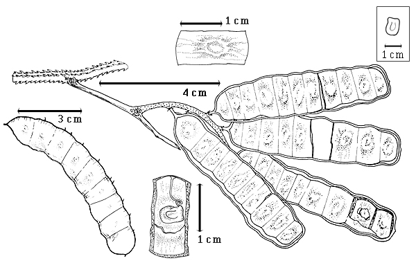 Fruit: A legume; unilocular; 8–13 cm long; 2–3 cm wide; 0.2–0.3 cm thick; 2–9 times longer than wide; with deciduous androecial sheath; with deciduous corolla; with deciduous calyx; without orifice formed by curving of fruit or fruit segments; straight to curved; not plicate; not twisted; symmetrical; oblong; not inflated; flattened; without beak; rounded at apex; aligned with longitudinal axis of fruit; rounded at base; aligned with longitudinal axis of fruit; with the apex and base uniform in texture; coriaceous; seed chambers externally visible, or invisible; margin constricted; margin slightly constricted along both margins; margin without sulcus; margin plain, or embellished; margin with prickles; wing(s) absent; stipitate; with the stipe 5–7 mm long; indehiscent. Replum visible. Epicarp dull; monochrome; greenish to reddish tan; with surface texture uniform; glabrous; eglandular; without spines; not smooth; with elevated features; veined; reticulately veined; not tuberculate; exfoliating; without cracks; without embedded tissue, much thicker than epicarp, running from base to apex. Mesocarp absent. Endocarp present; visible; dull (separating into segments and from exocarp and sutures); opaque; monochrome; brown (darker in seed chamber); smooth; without adhering pieces of testa; septate; not exfoliating; separating from epicarp; separating into 1-seeded winged segments (falling free from replum). Seed(s) 12–14; length oblique to fruit length; neither overlapping nor touching; in 1 series. Funiculus to 10 mm long; of 1 length only; filiform; plicate. Aril absent.