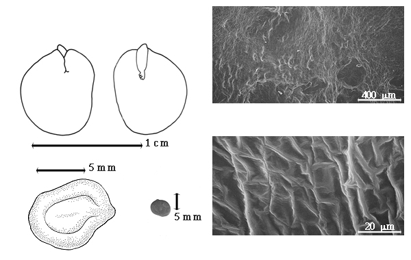 Seed: 7 mm long; 5.5 mm wide; 1.5 mm thick; not overgrown; not angular; symmetrical; oblong; compressed; with surface smooth; without visible radicle and cotyledon lobes; without hilar sinus; without umbo on seed faces; without medial ridge on each face. Cuticle not exfoliating; not inflated; not wrinkled. Testa present; without pieces of adhering epicarp; not adhering to endocarp; free from endocarp; glossy; not modified by a bloom; colored; monochrome; brown; glabrous; smooth; coriaceous. Pleurogram present; 90 %. Pseudopleurogram absent. Fracture lines absent. Rim absent. Wing(s) absent. Raphe not visible. Hilum present; fully concealed; concealed by funicular remnant; without faboid split; punctiform; subapical to radicle tip; flush; not within corona, halo, or rim. Lens not discernible. Endosperm present; thin; not pluglike and not resembling tip of radicle; adnate to testa. Cotyledons smooth; both outer faces flat; both the same thickness; both more or less of equal length; not folded; margin entire 180 degrees from base of radicle; similar at apex; partially concealing radicle; with lobes; with lobes touching (auriculate); with the interface division terminating at base of radicle; with margin(s) recessed; inner face flat; glabrous on inner face. Embryonic axis straight; parallel to length of seed; without a joint evident between the radicle and the cotyledons. Radicle differentiated from cotyledon; straight with embryonic axis; centered between cotyledons; less than 1/2 length of cotyledons. Plumule rudimentary; glabrous.