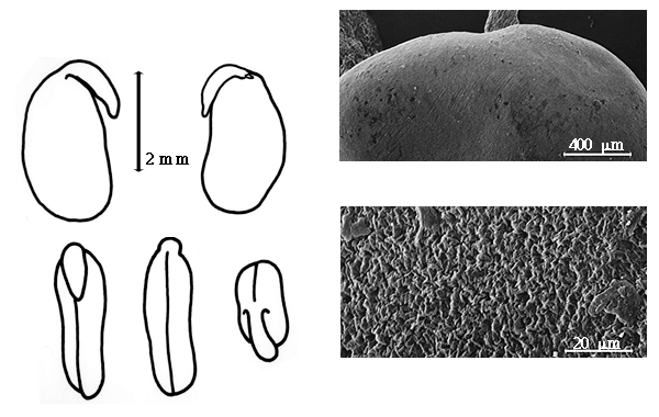 Seed: 4–5 mm long; 1.5–2.5 mm wide; 1.5–2.5 mm thick; not overgrown; not angular; symmetrical; circular to oblong; compressed; without visible radicle and cotyledon lobes; without hilar sinus; without umbo on seed faces; without medial ridge on each face. Cuticle not exfoliating; not inflated; not wrinkled. Testa present; without pieces of adhering epicarp; not adhering to endocarp; free from endocarp; dull; not modified by a bloom; colored; monochrome; brownish black; glabrous; smooth; coriaceous. Pleurogram absent. Pseudopleurogram absent. Fracture lines absent. Rim absent. Wing(s) absent. Raphe not visible. Hilum present; fully concealed; concealed by aril; without faboid split; punctiform; marginal according to radicle tip; flush; not within corona, halo, or rim. Lens not discernible. Endosperm present; thin; not pluglike and not resembling tip of radicle; covering entire embryo; adnate to testa. Cotyledons smooth; both outer faces convex; both the same thickness; both more or less of equal length; not folded; margin entire 180 degrees from base of radicle; similar at apex; not concealing radicle; entire over radicle; without lobes; with the interface division terminating at base of radicle; without margins recessed; yellow; inner face flat; glabrous on inner face. Embryonic axis deflexed; oblique to length of seed; without a joint evident between the radicle and the cotyledons. Radicle differentiated from cotyledon; linear; oblique to cotyledons; centered between cotyledons; less than 1/2 length of cotyledons. Plumule rudimentary; glabrous.