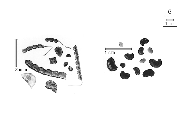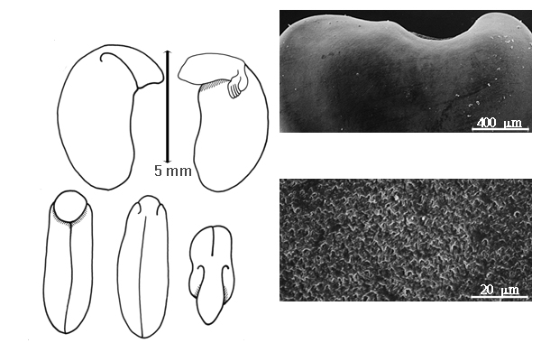 Seed: 1–6 mm long; 0.7–5 mm wide; 2–2.5 mm thick; not overgrown; not angular; asymmetrical; reniform; compressed; with visible radicle and cotyledon lobes; without external groove between radicle and cotyledon lobes; without hilar sinus; without umbo on seed faces; without medial ridge on each face. Cuticle not exfoliating; not inflated; not wrinkled. Testa present; without pieces of adhering epicarp; not adhering to endocarp; free from endocarp; glossy; not modified by a bloom; colored; monochrome; black (and greenish), or brown (light); glabrous; smooth; coriaceous. Pleurogram absent. Pseudopleurogram absent. Fracture lines absent. Rim absent. Raphe not visible. Hilum present; fully concealed; concealed by funicular remnant; with faboid split; with the lips of the faboid split the same color as the rest of the hilum, or lighter colored than the rest of the hilum and therefore conspicuous; larger than punctiform; 1.5 mm long; with curved outline; elliptic; marginal according to radicle tip, or between cotyledon and radicle lobe; flush; within halo; halo lighter than testa. Lens not discernible. Endosperm present; thin; not pluglike and not resembling tip of radicle; covering entire embryo; adnate to testa. Cotyledons smooth; both outer faces convex; both the same thickness; both more or less of equal length; not folded; margin entire 180 degrees from base of radicle; similar at apex; not concealing radicle; split over radicle; with lobes; with lobes not touching; with the interface division terminating at base of radicle; without margins recessed; inner face flat; glabrous on inner face. Embryonic axis deflexed; perpendicular to length of seed; without a joint evident between the radicle and the cotyledons. Radicle differentiated from cotyledon; bulbose; lobe tip straight, or curved; deflexed and parallel to cotyledon width; centered between cotyledons; 1/2 to nearly length of cotyledons. Plumule rudimentary, or well developed; glabrous.