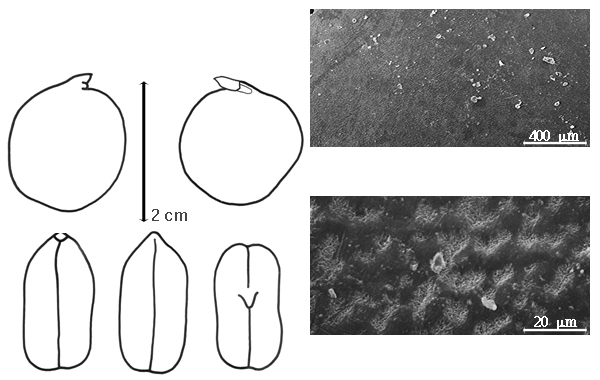 Seed: 15–60 mm long; 13–40 mm wide; 10–13 mm thick; not overgrown; not angular; symmetrical; elliptic to ovate to circular (nearly); terete; with surface smooth; without visible radicle and cotyledon lobes; without hilar sinus; without umbo on seed faces; without medial ridge on each face. Cuticle not exfoliating; not inflated; not wrinkled. Testa present; without pieces of adhering epicarp; not adhering to endocarp; free from endocarp; glossy; not modified by a bloom; colored; mottled; with frequent mottles; brown; with brown overlay (darker); glabrous; smooth; coriaceous. Pleurogram absent. Pseudopleurogram absent. Fracture lines absent. Rim absent. Wing(s) absent. Raphe not visible. Hilum present; visible; with faboid split; with the lips of the faboid split lighter colored than the rest of the hilum and therefore conspicuous; larger than punctiform; 15–25 mm long; with straight outline; linear; apical according to radicle tip but marginal according to seed length; flush; not within corona, halo, or rim. Lens discernible; 3–3.5 mm long; with margins straight; narrowly triangular; not in groove of raphe; confluent with hilum; flush; similar color as testa; darker than testa; brown; not within corona, halo, or rim. Endosperm absent. Cotyledons not smooth; 1–3 grooves on each face; both outer faces convex; both the same thickness; both more or less of equal length; not folded; margin entire 180 degrees from base of radicle; similar at apex; partially concealing radicle; notched at radicle; without lobes; with the interface division terminating at base of radicle; without margins recessed; pale yellow; inner face flat; glabrous on inner face. Embryonic axis oblique; oblique to length of seed; without a joint evident between the radicle and the cotyledons. Radicle differentiated from cotyledon; triangular; lobe tip straight; oblique to cotyledons; centered between cotyledons; less than 1/2 length of cotyledons. Plumule moderately developed; glabrous.