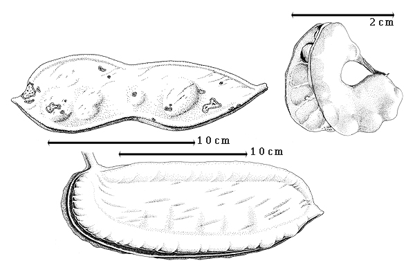 Fruit: A legume; unilocular; 7–30 cm long; 3–13 cm wide; 1–4 cm thick; 2–9 times longer than wide; with deciduous androecial sheath; with deciduous corolla; with deciduous calyx; without orifice formed by curving of fruit or fruit segments; straight to curved; not plicate; not twisted; asymmetrical; nearly elliptic to oblong; not inflated; compressed; without beak; long tapered at apex; aligned with longitudinal axis of fruit to right-angled with longitudinal axis of fruit (sometimes with small beak); rounded at base; aligned with longitudinal axis of fruit to right angled with longitudinal axis of fruit; with the apex and base uniform in texture; ligneous; seed chambers externally visible, or invisible; margin constricted, or not constricted; margin slightly constricted along both margins; margin without sulcus; margin plain; wing(s) absent; stipitate; with the stipe 6–8 mm long; with all layers dehiscing; splitting along suture(s). Dehiscence of valves along 1 suture, or both sutures; passive. Replum invisible. Epicarp dull; monochrome; blackish to dirty brown; with surface texture uniform; glabrous; eglandular; without spines; not smooth; with elevated features; not veined; not tuberculate; transversely fibrous to faintly rugose; not exfoliating; without cracks; without embedded tissue, much thicker than epicarp, running from base to apex. Mesocarp present; surface not veined; 2-layered; without balsamic vesicles; with fibers; without reniform canals; with fibers transeverse over spongy tissue, or over solid layer (?); ligneous. Endocarp present; visible; dull; opaque; monochrome; whitish tan to tan; sometimes reddish brown scurfy; without adhering pieces of testa; septate to subseptate; not exfoliating; remaining fused to mesocarp and epicarp; entire. Seed(s) 1–12; length transverse to fruit length; neither overlapping nor touching; in 1 series. Funiculus 0.1–3 mm long; of 1 length only; flattened; straight. Aril present, or absent (orange, yellow, orange red, red yellow, whitish, or brown); fleshy (?); when fleshy caplike; entire; covering up to 1/2 to nearly all of seed.