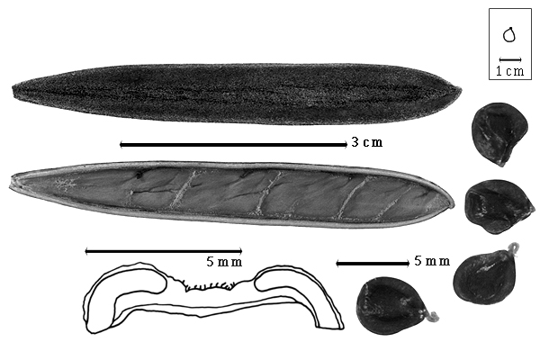 Seed: 3.5–6 mm long; 2–4.5 mm wide; 1.5–1.7 mm thick; not overgrown; not angular; symmetrical, or asymmetrical; ovate, or elliptic, or irregular; compressed; with surface smooth; without visible radicle and cotyledon lobes; without hilar sinus; without umbo on seed faces; without medial ridge on each face. Cuticle not exfoliating; not wrinkled. Testa present; without pieces of adhering epicarp; not adhering to endocarp; free from endocarp; glossy; not modified by a bloom; colored; monochrome; brown; not smooth; with elevated features; wrinkled; chartaceous. Pleurogram present (darker than the testa, almost black); 95–98 %. Pseudopleurogram absent. Fracture lines absent. Rim absent. Wing(s) absent. Raphe not visible. Hilum present; fully concealed; concealed by funicular remnant; without faboid split (assumed); larger than punctiform; 0.4 mm long; with curved outline; oval; raised; within corona; corona color lighter than testa. Lens discernible; 0.3 mm long; with margins curved; circular; not in groove of raphe; adjacent to hilum; 0.2 mm from hilum; flush; dissimilar color from testa; lighter than testa; white; within halo; halo color darker than testa (black and horse-shaped, surrounding the lens on three sides closest to hilum). Endosperm present (a clear mucoid-like substance); thick; not pluglike and not resembling tip of radicle; covering at least 1/2 of embryo, but not entire embryo; adnate to embryo. Cotyledons smooth; both outer faces flat; both the same thickness; both more or less of equal length; not folded; margin entire 180 degrees from base of radicle; similar at apex; partially concealing radicle; split over radicle; with lobes; with lobes overlapping; with basal groin formed by lobes; with the interface division terminating at base of radicle; without margins recessed; dark brown; inner face flat; glabrous on inner face. Embryonic axis straight; parallel to length of seed; without a joint evident between the radicle and the cotyledons. Radicle differentiated from cotyledon; bulbose; lobe tip straight; straight with embryonic axis; centered between cotyledons; less than 1/2 length of cotyledons. Plumule well developed; glabrous.
