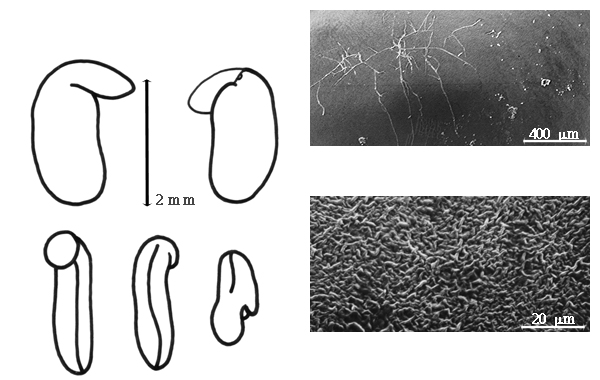 Seed: 2–3 mm long; 0.8–2.3 mm wide; 1.3 mm thick; overgrown, 1 seed filling entire fruit cavity; angular; asymmetrical; reniform, or quadrangular; compressed; with surface smooth; with visible radicle and cotyledon lobes; with external groove between radicle and cotyledon lobes, or without external groove between radicle and cotyledon lobes; with external groove between radicle and cotyledon lobes same color as testa; without hilar sinus; without umbo on seed faces; without medial ridge on each face. Cuticle not exfoliating; not inflated; not wrinkled. Testa present; without pieces of adhering epicarp; not adhering to endocarp; free from endocarp; dull; not modified by a bloom; colored; monochrome, or mottled; with frequent mottles; brown to blackish brown, or tan, or yellow, or green, or black; with black overlay (to purplish black); glabrous; smooth; coriaceous. Pleurogram absent. Pseudopleurogram absent. Fracture lines absent. Rim absent. Wing(s) absent. Raphe not visible. Hilum present; visible; with faboid split; with the lips of the faboid split the same color as the rest of the hilum; punctiform; between cotyledon and radicle lobe; recessed; not within corona, halo, or rim. Lens discernible; 0.5 mm long; with margins straight; diamond-shaped, or irregular; not in groove of raphe; confluent with hilum, or adjacent to hilum; 0.1 mm from hilum; mounded; dissimilar color from testa; darker than testa; blackish brown, or black; not within corona, halo, or rim. Endosperm present; thick; not pluglike and not resembling tip of radicle; covering entire embryo; adnate to embryo. Cotyledons smooth; both outer faces convex; both the same thickness; both more or less of equal length; not folded; margin entire 180 degrees from base of radicle; similar at apex; not concealing radicle; entire over radicle; without lobes; with the interface division terminating at base of radicle; without margins recessed; white; inner face flat; glabrous on inner face. Embryonic axis deflexed; oblique to length of seed; without a joint evident between the radicle and the cotyledons. Radicle differentiated from cotyledon; linear; deflexed and parallel to cotyledon length; centered between cotyledons; less than 1/2 length of cotyledons. Plumule rudimentary; glabrous.