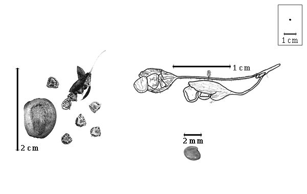 Seed: 1.8–3 mm long; 1.8–3 mm wide; 0.8 mm thick; not overgrown; not angular; asymmetrical; mitaform; compressed; with visible radicle and cotyledon lobes; without external groove between radicle and cotyledon lobes; without hilar sinus; without umbo on seed faces; without medial ridge on each face. Cuticle not exfoliating; not inflated; not wrinkled. Testa present; without pieces of adhering epicarp; not adhering to endocarp; free from endocarp; dull; not modified by a bloom; colored; monochrome; reddish brown; glabrous; smooth; chartaceous. Pleurogram absent. Pseudopleurogram absent. Fracture lines absent. Rim absent. Wing(s) absent. Raphe not visible. Hilum present; visible; without faboid split (perhaps too small to see split); punctiform; between cotyledon and radicle lobe; recessed; not within corona, halo, or rim. Lens not discernible. Endosperm absent. Cotyledons smooth; both outer faces convex; both the same thickness; both more or less of equal length; not folded; margin entire 180 degrees from base of radicle; similar at apex; not concealing radicle; split over radicle; with lobes; with lobes not touching; with the interface division terminating at base of radicle; without margins recessed; red (dish); inner face flat; glabrous on inner face. Embryonic axis deflexed; parallel to length of seed; without a joint evident between the radicle and the cotyledons. Radicle differentiated from cotyledon; linear; deflexed and parallel to cotyledon length; centered between cotyledons; 1/2 to nearly length of cotyledons. Plumule rudimentary; glabrous.