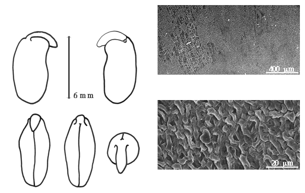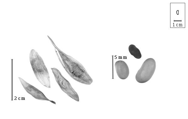 Seed: 3.5–8.2 mm long; 2–4.5 mm wide; 1.8–4.5 mm thick; not overgrown; not angular; symmetrical; oblong, or ovate; terete, or compressed; with surface smooth; without visible radicle and cotyledon lobes; without hilar sinus; without umbo on seed faces; without medial ridge on each face. Cuticle not exfoliating; not inflated; not wrinkled. Testa present; without pieces of adhering epicarp; not adhering to endocarp; free from endocarp; dull; not modified by a bloom; colored; monochrome; brown to orange; glabrous; not smooth; with elevated features; wrinkled; chartaceous. Pleurogram absent. Pseudopleurogram absent. Fracture lines absent. Rim absent. Wing(s) absent. Raphe not visible. Hilum present; visible; with faboid split; with the lips of the faboid split lighter colored than the rest of the hilum and therefore conspicuous; larger than punctiform; 0.3–1.2 mm long; with curved outline; circular to elliptic; subapical to radicle tip; recessed; within rim; rim color lighter than testa. Lens discernible; 0.5–2 mm long; with margins straight; linear; not in groove of raphe; confluent with hilum; flush; same color as testa; brown; not within corona, halo, or rim. Endosperm present; thin, or trace; not pluglike and not resembling tip of radicle; covering entire embryo; adnate to embryo. Cotyledons smooth; both outer faces convex; both the same thickness; both more or less of equal length; not folded; margin entire 180 degrees from base of radicle; similar at apex; partially concealing radicle; split over radicle; with lobes; with lobes touching (auriculate); without basal groin formed by lobes; with the interface division terminating at base of radicle; without margins recessed; yellow, or green; inner face flat; glabrous on inner face. Embryonic axis oblique; perpendicular to length of seed; without a joint evident between the radicle and the cotyledons. Radicle differentiated from cotyledon; linear; lobe tip curved; oblique to cotyledons; centered between cotyledons; less than 1/2 length of cotyledons. Plumule rudimentary; glabrous.