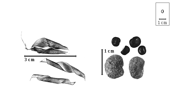 Seed: 4–16 mm long; 4–11.3 mm wide; 1.5–7.4 mm thick; not overgrown, or overgrown, 1 seed filling entire fruit cavity; not angular; symmetrical; reniform, or ovate; compressed; with surface smooth, or ridged; without visible radicle and cotyledon lobes, or with visible radicle and cotyledon lobes; without external groove between radicle and cotyledon lobes; without hilar sinus; without umbo on seed faces; without medial ridge on each face. Cuticle not exfoliating; not inflated; not wrinkled. Testa present; without pieces of adhering epicarp; not adhering to endocarp; free from endocarp; dull; not modified by a bloom; colored; mottled; brown (or reddish brown); with brown overlay (dark); glabrous; smooth, or not smooth; with elevated features; wrinkled; coriaceous, or chartaceous. Pleurogram absent. Pseudopleurogram absent. Fracture lines absent. Rim absent. Wing(s) absent. Raphe not visible. Hilum present; partially concealed; concealed by aril; with faboid split, or without faboid split; with the lips of the faboid split the same color as the rest of the hilum; larger than punctiform; 0.5–2 mm long; with curved outline; elliptic; apical according to radicle tip but marginal according to seed length; recessed; within rim; rim color of testa, or darker than testa. Lens discernible; 0.5–1.5 mm long; with margins straight; linear; not in groove of raphe; confluent with hilum; flush; similar color as testa; darker than testa; brown; not within corona, halo, or rim, or within rim; rim color darker than testa. Endosperm absent, or present; trace; not pluglike and not resembling tip of radicle; restricted to region of embryo; adnate to testa. Cotyledons smooth; both outer faces convex; both the same thickness; both more or less of equal length; not folded; margin entire 180 degrees from base of radicle; similar at apex; partially concealing radicle; notched at radicle; without lobes; with the interface division terminating at base of radicle; without margins recessed; tan, or white; inner face flat; glabrous on inner face. Embryonic axis oblique; oblique to length of seed; without a joint evident between the radicle and the cotyledons. Radicle differentiated from cotyledon; narrowly triangular; lobe tip curved; oblique to cotyledons; centered between cotyledons; less than 1/2 length of cotyledons. Plumule moderately developed; glabrous.
