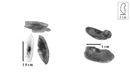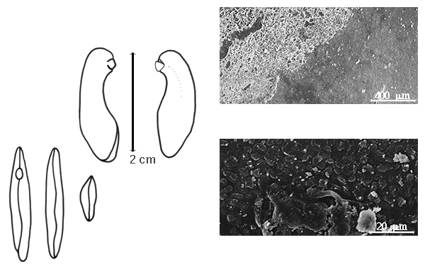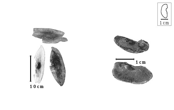 Seed: 18–34 mm long; 8.5–16 mm wide; 3–7.2 mm thick; not overgrown; not angular; symmetrical, or asymmetrical; elliptic to reniform; flattened; with surface smooth; without visible radicle and cotyledon lobes; without hilar sinus; without umbo on seed faces; without medial ridge on each face. Cuticle not exfoliating; not inflated; not wrinkled. Testa present; without pieces of adhering epicarp; not adhering to endocarp, or partially adhering to endocarp (like a powdery coating); free from endocarp; dull; not modified by a bloom; colored; monochrome; dark brown; glabrous; not smooth; with elevated features; rugose and bearing endocarp remnants; chartaceous. Pleurogram absent. Pseudopleurogram absent. Fracture lines absent. Rim absent. Wing(s) absent. Raphe not visible. Hilum present; fully concealed; concealed by funicular remnant and aril; with faboid split; with the lips of the faboid split the same color as the rest of the hilum; larger than punctiform; 3–7.5 mm long; with curved outline, or straight outline; elliptic; linear; apical according to radicle tip but marginal according to seed length; recessed; not within corona, halo, or rim. Lens discernible, or not discernible; 1–2.5 mm long; with margins curved; circular; not in groove of raphe; confluent with hilum; recessed; same color as testa; brown; not within corona, halo, or rim. Endosperm absent. Cotyledons smooth; both outer faces convex; both the same thickness; both more or less of equal length, or 1 longer than other; not folded; margin entire 180 degrees from base of radicle; partially concealing radicle; notched at radicle; without lobes; with the interface division terminating at base of radicle; without margins recessed; green to tan; inner face flat; glabrous on inner face. Embryonic axis oblique, or right angled; oblique to length of seed, or perpendicular to length of seed; without a joint evident between the radicle and the cotyledons. Radicle differentiated from cotyledon; bulbose; lobe tip straight; deflexed and parallel to cotyledon width; centered between cotyledons; less than 1/2 length of cotyledons. Plumule rudimentary; glabrous.