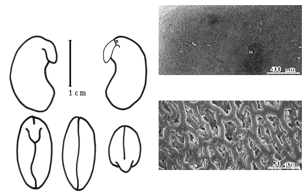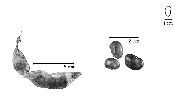 Seed: 10–15 mm long; 7–10 mm wide; 5–6.7 mm thick; not overgrown; not angular; asymmetrical; elliptic to oblong; compressed; with visible radicle and cotyledon lobes; without external groove between radicle and cotyledon lobes; without umbo on seed faces; without medial ridge on each face. Cuticle not exfoliating; not inflated; not wrinkled. Testa present; without pieces of adhering epicarp; not adhering to endocarp; free from endocarp; glossy; not modified by a bloom; colored; monochrome; dark to light brown, or tan; glabrous; smooth; osseous. Pleurogram absent. Pseudopleurogram absent. Fracture lines absent. Rim absent. Wing(s) absent. Raphe visible; from hilum through lens and terminating before base of seed; not bifurcating; darker than testa; dark reddish brown; flush. Hilum present; visible; with faboid split; with the lips of the faboid split the same color as the rest of the hilum; larger than punctiform; 2 mm long; with curved outline, or straight outline; elliptic; oblong; marginal according to radicle tip; recessed; within rim; rim color of testa. Lens discernible; 1 mm long; with margins curved; circular; not in groove of raphe; adjacent to hilum; 2 mm from hilum; barely mounded; dissimilar color from testa; darker than testa; reddish brown; not within corona, halo, or rim. Endosperm present; thick; not pluglike and not resembling tip of radicle; covering entire embryo; adnate to testa. Cotyledons smooth; both outer faces convex; both the same thickness; both more or less of equal length; not folded; margin entire 180 degrees from base of radicle; similar at apex; not concealing radicle; entire over radicle; without lobes; with the interface division terminating at base of radicle; with margin(s) recessed; yellow; inner face flat; glabrous on inner face. Embryonic axis deflexed; oblique to length of seed; without a joint evident between the radicle and the cotyledons. Radicle differentiated from cotyledon; linear; lobe tip curved; deflexed and parallel to cotyledon length; centered between cotyledons; less than 1/2 length of cotyledons. Plumule moderately developed; glabrous.