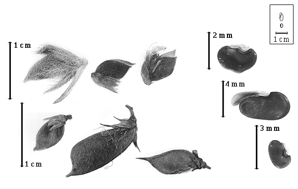 Fruit: A legume; unilocular; 0.3–1.5 cm long; 0.2–0.7 cm wide; 0.2 cm thick; length less than twice as long as width, or wider than long; with deciduous androecial sheath; with deciduous corolla; with persistent calyx; with calyx shorter than fruit; without orifice formed by curving of fruit or fruit segments; straight; not plicate; not twisted; asymmetrical; oblong to ovate, or dolabriform; with 1 straight and 1 curved suture, or both sutures unequally curved, or both sutures parallelly curved, or both sutures nearly straight; widest near middle or D-shaped; not inflated; compressed; with beak, or without beak; straight; with solid beak the same color and texture as fruit; short tapered at apex, or rounded at apex; aligned with longitudinal axis of fruit; short tapered at base, or rounded at base; aligned with longitudinal axis of fruit, or oblique with longitudinal axis of fruit; with the apex and base uniform in texture; coriaceous; seed chambers externally invisible; margin not constricted; margin without sulcus; margin plain; wing(s) absent; substipitate, or nonstipitate; with all layers dehiscing; splitting along suture(s). Dehiscence of valves along both sutures; apical and down; passive, or active (barely); with valves enrolling (somewhat). Replum invisible. Epicarp dull; monochrome; greenish to dirty or reddish brown (concealed by long straight dense hairs), or gray (because of hairs); with surface texture uniform; pubescent and indurate; with hairs erect; with 1 type of pubescence; tomentose, or sericeous, or villous (A. parvifolia C.F. Ecklon & J.M. Zeyher); with pubescence gray, or golden; with pubescence uniformly distributed; with simple hairs; pliable; with hair bases plain; eglandular; without spines; smooth; not veined; not tuberculate; not exfoliating; without cracks; without embedded tissue, much thicker than epicarp, running from base to apex. Mesocarp present; thin; surface not veined, or uniformly veined; 1-layered; without balsamic vesicles; without fibers; without reniform canals; solid; coriaceous. Endocarp present; visible; dull; opaque; monochrome; tan; spongy, or smooth; without adhering pieces of testa; nonseptate; chartaceous; not exfoliating; remaining fused to mesocarp and epicarp; without wings; entire. Seed(s) 1–4 (several); length parallel with fruit length; neither overlapping nor touching; in 1 series. Funiculus of 1 length only; thick, or triangular; straight. Aril present; fleshy; when fleshy cupshaped (with tonguelike extension); entire; covering less than 1/2 of seed; reddish brown.