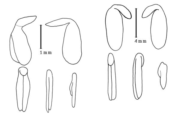 Seed: 1.5–5.5 mm long; 0.9–3 mm wide; 0.5–1.2 mm thick; not overgrown; not angular; asymmetrical; reniform (oblong), or oblong; compressed; with surface smooth; with visible radicle and cotyledon lobes (to slightly so), or without visible radicle and cotyledon lobes; without external groove between radicle and cotyledon lobes; without hilar sinus; without umbo on seed faces; without medial ridge on each face. Cuticle not exfoliating; not inflated; not wrinkled. Testa present; without pieces of adhering epicarp; not adhering to endocarp; free from endocarp; dull; not modified by a bloom; colored; monochrome, or streaked and mottled; with frequent mottles; with frequent streaks; reddish brown to brown; with black overlay; glabrous; smooth; coriaceous. Pleurogram absent. Pseudopleurogram absent. Fracture lines absent. Rim absent. Wing(s) absent. Raphe not visible (perhaps concealed by aril). Hilum present; visible; with faboid split; with the lips of the faboid split lighter colored than the rest of the hilum and therefore conspicuous, or the same color as the rest of the hilum (nearly so); larger than punctiform; 0.5 mm long; with curved outline; circular, or elliptic; between cotyledon and radicle lobe; recessed; within rim, or within halo; halo lighter than testa; rim color darker than testa. Lens not discernible (perhaps concealed by aril), or discernible (but concealed under aril). Endosperm present, or absent; thin; not pluglike and not resembling tip of radicle; covering entire embryo; adnate to embryo. Cotyledons smooth; both outer faces convex; both the same thickness; both more or less of equal length; not folded; margin entire 180 degrees from base of radicle, or not entire 180 degrees from base of radicle; similar at apex; not concealing radicle; entire over radicle; without lobes; with the interface division terminating at base of radicle; without margins recessed; tan, or green; inner face flat; glabrous on inner face. Embryonic axis deflexed; oblique to length of seed; without a joint evident between the radicle and the cotyledons. Radicle differentiated from cotyledon; bulbose, or linear; lobe tip straight; deflexed and parallel to cotyledon width, or oblique to cotyledons; centered between cotyledons; less than 1/2 length of cotyledons, or 1/2 to nearly length of cotyledons. Plumule rudimentary; glabrous.