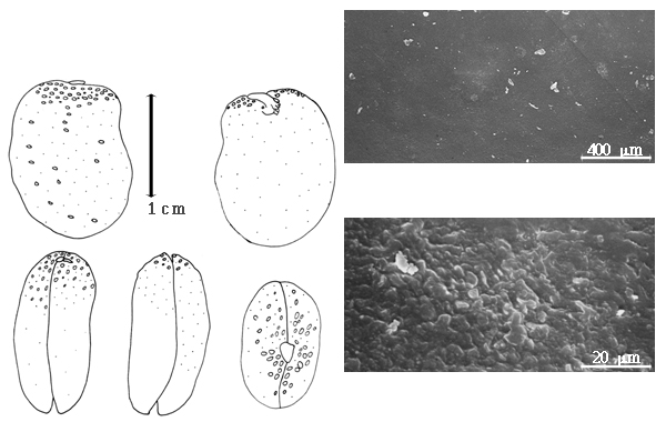 Seed: 15–20 mm long; 13–16 mm wide; 7–10 mm thick; not overgrown; not angular; asymmetrical; obliquely elliptic, or ovate (obliquely); compressed to terete; with surface smooth; without visible radicle and cotyledon lobes; without hilar sinus; without umbo on seed faces; without medial ridge on each face. Cuticle not exfoliating; not inflated; not wrinkled. Testa present; without pieces of adhering epicarp; not adhering to endocarp; free from endocarp; glossy; not modified by a bloom; colored; monochrome, or mottled; with infrequent mottles; brown, or red; with brown overlay (darker); glabrous; smooth; chartaceous. Pleurogram absent. Pseudopleurogram absent. Fracture lines absent. Rim absent. Wing(s) absent. Raphe not visible. Hilum present; partially concealed; concealed by aril; without faboid split; larger than punctiform; 2–3 mm long; with curved outline; elliptic to circular; apical according to radicle tip but marginal according to seed length; raised; within halo; halo darker than testa. Lens not discernible. Endosperm absent. Cotyledons not smooth; glandular dotted (yellow latex-like substance inside); both outer faces convex; both the same thickness; both more or less of equal length; not folded; margin entire 180 degrees from base of radicle; similar at apex; partially concealing radicle; split over radicle; with lobes; with lobes touching (auriculate); without basal groin formed by lobes; with the interface division terminating at base of radicle; without margins recessed; tan; inner face flat and glandular dotted (with yellow latex-like substance inside); glabrous on inner face. Embryonic axis right angled; oblique to length of seed; without a joint evident between the radicle and the cotyledons. Radicle differentiated from cotyledon; triangular; lobe tip straight; with 90 degree turn; centered between cotyledons; less than 1/2 length of cotyledons. Plumule rudimentary; glabrous.