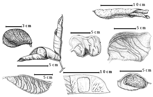 Fruit and seed: A. crassifolia (H.E. Baillon) J.J.G. Léonard - 4th row center fruit; A. fragrans (E.G. Baker) Exell & Hillcoat - 3rd row top fruit; A. gracilliflora H.A.T. Harms - 2nd row seeds in situ; A. lamprophylla (H.A.T. Harms) J.J.G. Léonard - 1st row bottom partially dehisced fruit; A. macrophylla A.M.F.J. Palisot de Beauvois - 4th row top enrolled valves, 3rd row bottom seed in situ; A. vignei (A.C. Hoyle) J.J.G. Léonard - 1st row top partially dehisced fruit, 4th row bottom seed in situ.