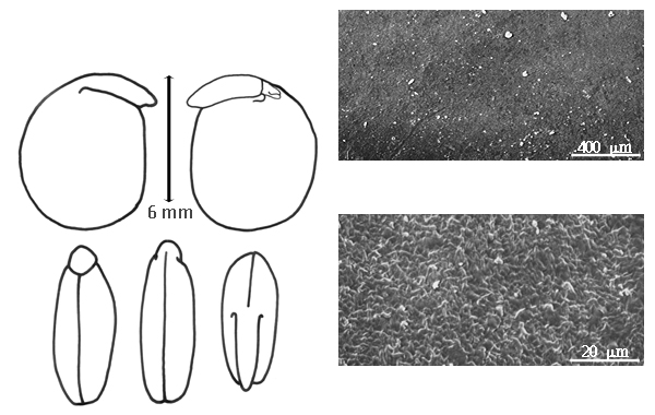 Seed: 7–12 mm long; 5–10 mm wide; 3–4.2 mm thick; not overgrown; not angular; symmetrical, or asymmetrical; circular, or elliptic, or ovate (obliquely); compressed; with surface smooth; without visible radicle and cotyledon lobes; without hilar sinus; without umbo on seed faces; without medial ridge on each face. Cuticle not exfoliating; not inflated; not wrinkled. Testa present; without pieces of adhering epicarp; not adhering to endocarp; free from endocarp; dull; not modified by a bloom; colored; monochrome; red-brown or brown; glabrous; smooth, or not smooth; with elevated features; minutely rugose, or wrinkled; chartaceous. Pleurogram absent. Pseudopleurogram absent. Fracture lines absent. Rim absent. Wing(s) absent. Raphe not visible. Hilum present; partially concealed; concealed by aril; with faboid split; larger than punctiform; 1.2–2 mm long; with curved outline; elliptic; apical according to radicle tip but marginal according to seed length; flush; within rim; rim color lighter than testa, or darker than testa. Lens discernible, or not discernible; 1.2–1.8 mm long; with margins straight, or curved; linear; 2 oblong mounds separated by groove; not in groove of raphe; confluent with hilum; mounded; similar color as testa; darker than testa; brown; within rim, or not within corona, halo, or rim; rim color of testa. Endosperm absent. Cotyledons smooth, or not smooth; sparsely glandular dotted (yellow latex-like substance inside); both outer faces convex; both the same thickness; both more or less of equal length; not folded; margin entire 180 degrees from base of radicle; similar at apex; partially concealing radicle; entire over radicle; without lobes; with the interface division terminating at base of radicle; without margins recessed; green, or tan; inner face flat; glabrous on inner face. Embryonic axis oblique, or right angled; parallel to length of seed; without a joint evident between the radicle and the cotyledons. Radicle differentiated from cotyledon; bulbose, or linear; lobe tip straight, or curved; oblique to cotyledons; centered between cotyledons; less than 1/2 length of cotyledons. Plumule rudimentary to moderately developed; glabrous.