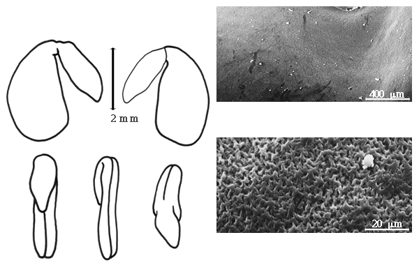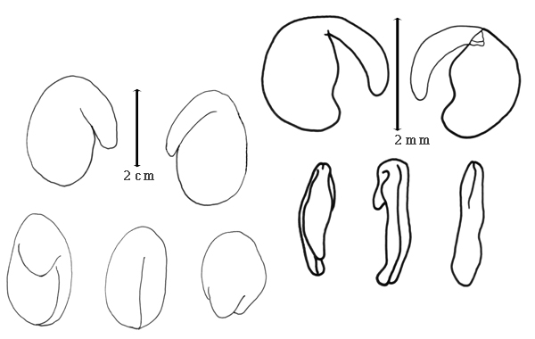 Seed: 1–7 mm long; 0.8–5 mm wide; 0.1–2 mm thick; not overgrown, or overgrown, 1 seed filling entire fruit cavity (rarely); not angular, or angular (dented or not on faces); asymmetrical, or symmetrical (except hilum); mitaform, or oblong, or reniform, or rectangular, or rhombic, or triangular, or pyriform, or elliptic, or D-shaped, or cordate, or irregular; compressed; with surface smooth; without visible radicle and cotyledon lobes, or with visible radicle and cotyledon lobes; without external groove between radicle and cotyledon lobes, or with external groove between radicle and cotyledon lobes; with external groove between radicle and cotyledon lobes same color as testa, or lighter in color than testa; with deep hilar sinus, or with shallow hilar sinus, or without hilar sinus; without umbo on seed faces; without medial ridge on each face. Cuticle not exfoliating; not inflated; not wrinkled. Testa present; without pieces of adhering epicarp; not adhering to endocarp; free from endocarp; dull, or glossy; not modified by a bloom; colored, or clear (sometimes, except for mottles, in Astragalus pelecinus (L.) Barneby); monochrome, or mottled, or mottled and streaked; with frequent mottles, or infrequent mottles; with frequent streaks, or infrequent streaks; brown to reddish to yellowish brown, or tan (to greenish tan), or cream, or green (yellowish), or olive, or orange, or yellow, or purple, or black; with black overlay, or purple overlay, or red overlay; glabrous; smooth (sometimes with a fine reticulate-colored pattern on smooth surface), or not smooth; with elevated features, or recessed features; rugose, or wrinkled (reticutely in Astragalus pelecinus (L.) Barneby); pitted with small separate pits, or concaved, or punctate (in Astragalus pelecinus (L.) Barneby); coriaceous, or chartaceous. Pleurogram absent. Pseudopleurogram absent. Fracture lines absent. Rim absent. Wing(s) absent. Raphe not visible, or visible; from hilum to lens; not bifurcating; darker than testa; reddish brown to brown; flush, or raised. Hilum present; visible, or partially concealed, or fully concealed; concealed by wing, or radicle lobe, or funicular remnant; with faboid split; with the lips of the faboid split the same color as the rest of the hilum; punctiform, or larger than punctiform; 0.1–0.5 mm long; with curved outline; circular; between cotyledon and radicle lobe; recessed (to slightly so), or flush; not within corona, halo, or rim, or within halo, or within rim; halo lighter than testa; rim color of testa. Lens discernible, or not discernible; 0.1–1 mm long; with margins straight, or curved; oblong, or linear, or triangular, or diamond-shaped; oblong, or elliptic, or 2 circular mounds separated by groove, or circular; not in groove of raphe; adjacent to hilum, or confluent with hilum; 0.1–0.3 mm from hilum; mounded, or flush; similar color as testa, or same color as testa, or dissimilar color from testa; darker than testa; brown, or tan (greenish); not within corona, halo, or rim. Endosperm present; thick, or thin; not pluglike and not resembling tip of radicle; covering entire embryo; adnate to embryo, or testa. Cotyledons smooth; both outer faces convex; both the same thickness; both more or less of equal length; not folded; margin entire 180 degrees from base of radicle; similar at apex; not concealing radicle; entire over radicle; without lobes; with the interface division terminating at base of radicle; without margins recessed; tan, or brown (reddish), or yellow, or white; inner face flat; glabrous on inner face. Embryonic axis deflexed; oblique to length of seed, or parallel to length of seed; without a joint evident between the radicle and the cotyledons. Radicle differentiated from cotyledon; bulbose (some almost 1/2 size of cotyledons); lobe tip straight, or curved, or hooked; deflexed and parallel to cotyledon length; centered between cotyledons; less than 1/2 length of cotyledons, or 1/2 to nearly length of cotyledons. Plumule rudimentary, or moderately developed; glabrous.