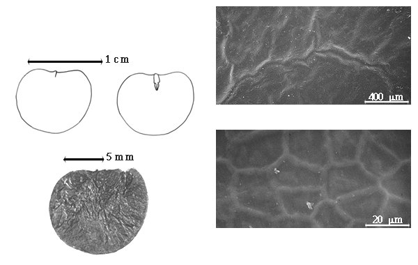 Seed: 13–15 mm long; 12–14 mm wide; 2 mm thick; not overgrown; not angular; symmetrical; reniform; flattened; with surface smooth; without visible radicle and cotyledon lobes; without hilar sinus; without umbo on seed faces; without medial ridge on each face. Cuticle not exfoliating; not inflated; not wrinkled. Testa present; without pieces of adhering epicarp; not adhering to endocarp; free from endocarp; dull; not modified by a bloom; colored; monochrome; brown; glabrous; not smooth; with elevated features; rugose (with reticulate pattern); chartaceous. Pleurogram absent. Pseudopleurogram absent. Fracture lines absent. Rim absent. Wing(s) absent. Raphe visible; color of testa, or lighter than testa; tan. Hilum present; fully concealed; concealed by funicular remnant; without faboid split; punctiform; apical at apex of radicle tip; flush; not within corona, halo, or rim. Lens discernible (on same side of hilum as micropyle); up to 5 mm long; with margins straight; irregular; not in groove of raphe; flush; dissimilar color from testa; darker than testa; black; not within corona, halo, or rim. Endosperm absent. Cotyledons smooth; both outer faces flat; both the same thickness; both more or less of equal length; not folded; margin entire 180 degrees from base of radicle; similar at apex; completely concealing radicle; split over radicle; with the interface division terminating at base of radicle; without margins recessed; inner face flat; glabrous on inner face. Embryonic axis straight; perpendicular to length of seed; without a joint evident between the radicle and the cotyledons. Radicle differentiated from cotyledon; straight with embryonic axis; centered between cotyledons. Plumule moderately developed; glabrous.
