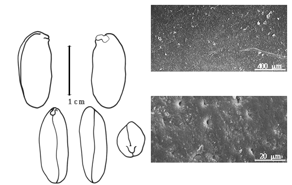 Seed: 10–25 mm long; 6–20 mm wide; 2–5 mm thick; not overgrown; not angular; symmetrical, or asymmetrical; circular, or elliptic, or irregular; compressed, or flattened; with surface smooth; without visible radicle and cotyledon lobes; without hilar sinus; without umbo on seed faces; without medial ridge on each face. Cuticle not exfoliating; not inflated; not wrinkled. Testa present; without pieces of adhering epicarp; not adhering to endocarp; free from endocarp; dull to glossy; not modified by a bloom; colored; monochrome, or bichrome; black, or brown, or red (to brick red), or black and red (to brick red); glabrous; smooth, or not smooth; with elevated features; wrinkled; chartaceous to coriaceous. Pleurogram absent. Pseudopleurogram absent. Fracture lines absent. Rim absent. Wing(s) absent. Raphe visible, or not visible; from hilum through lens to base of seed and terminating, or hilum through lens to base of seed and bifurcating; bifurcating at base of seed with each arm going up antiraphe side turning (U-shaped) down and approaching bifurcation; darker than testa; black; raised. Hilum present; partially concealed, or fully concealed; concealed by aril; without faboid split; larger than punctiform; 1–1.5 mm long; with curved outline; circular to elliptic; apical at apex of radicle tip, or subapical to radicle tip, or apical according to radicle tip but marginal according to seed length; recessed; within corona, or not within corona, halo, or rim; corona color darker than testa. Lens discernible, or not discernible; 1–1.5 mm long; with margins straight; linear; not in groove of raphe; confluent with hilum; mounded; similar color as testa; darker than testa; black, or brown; within corona, or not within corona, halo, or rim; corona color darker than testa. Endosperm present, or absent; trace; not pluglike and not resembling tip of radicle; covering at least 1/2 of embryo, but not entire embryo; adnate to testa. Cotyledons smooth; both outer faces convex; both the same thickness; both more or less of equal length; not folded; margin entire 180 degrees from base of radicle; partially concealing radicle; notched at radicle, or split over radicle; without lobes, or with lobes; with lobes overlapping, or touching (auriculate); with basal groin formed by lobes, or without basal groin formed by lobes; with the interface division terminating at base of radicle; without margins recessed; tan; inner face flat; glabrous on inner face. Embryonic axis oblique, or right angled; oblique to length of seed, or perpendicular to length of seed; without a joint evident between the radicle and the cotyledons. Radicle differentiated from cotyledon; linear; lobe tip straight, or curved (slightly); deflexed and parallel to cotyledon width, or oblique to cotyledons; centered between cotyledons; less than 1/2 length of cotyledons. Plumule rudimentary to moderately developed; glabrous.
