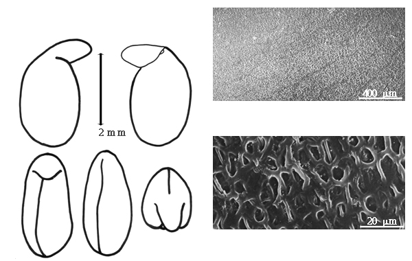Seed: 2.5–4.5 mm long; 2–3 mm wide; 1.6–2 mm thick; not overgrown; not angular; asymmetrical; D-shaped (with inconspicuous radicle lobe); compressed; with visible radicle and cotyledon lobes; without external groove between radicle and cotyledon lobes; without umbo on seed faces; without medial ridge on each face. Cuticle not exfoliating; not inflated; not wrinkled. Testa present; without pieces of adhering epicarp; not adhering to endocarp; free from endocarp; dull, or glossy; modified by a bloom; colored; monochrome; yellowish to dark brown, or tan, or white; glabrous; smooth, or not smooth; with elevated features; tuberculate (glandular exudates), or blistered cuticle (B. megacarpa A.W. Chapman ex J. Torrey & A. Gray); coriaceous. Pleurogram absent. Pseudopleurogram absent. Fracture lines absent. Rim absent. Wing(s) absent. Raphe visible; from lens to base of seed and terminating (near base); not bifurcating; darker than testa; black; slightly recessed, or flush. Hilum present; partially concealed; concealed by funicular remnant; with faboid split; with the lips of the faboid split the same color as the rest of the hilum; punctiform, or larger than punctiform; 0.3–0.4 mm long; with curved outline; circular; between cotyledon and radicle lobe; recessed; within rim, or within halo (occasionally and faintly); halo darker than testa; rim color of testa. Lens discernible, or not discernible; with margins curved; circular; not in groove of raphe; adjacent to hilum; 2 mm from hilum; flush; dissimilar color from testa; darker than testa; reddish brown; not within corona, halo, or rim. Endosperm present; thin; not pluglike and not resembling tip of radicle; covering entire embryo; adnate to testa. Cotyledons smooth; both outer faces convex; both the same thickness; both more or less of equal length; not folded; margin entire 180 degrees from base of radicle; similar at apex; not concealing radicle; entire over radicle; without lobes; with the interface division terminating at base of radicle; without margins recessed; yellow, or tan; inner face flat; glabrous on inner face. Embryonic axis deflexed; oblique to length of seed; without a joint evident between the radicle and the cotyledons. Radicle differentiated from cotyledon; linear; lobe tip curved; deflexed and parallel to cotyledon width; centered between cotyledons; less than 1/2 length of cotyledons. Plumule rudimentary; glabrous.