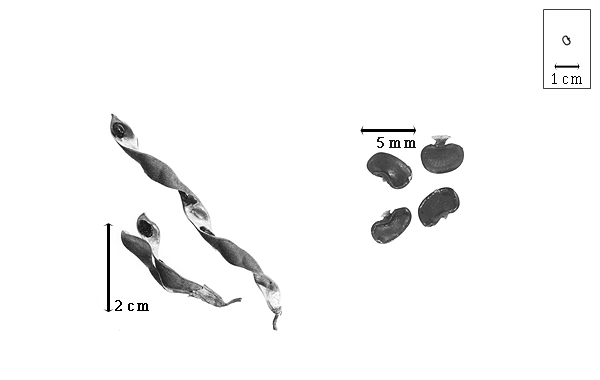 Fruit: A legume; unilocular; 5.5–10 cm long; 0.5–0.6 cm wide; 0.4 cm thick; 2–9 times longer than wide to more than 9 times longer than wide; with deciduous androecial sheath; with deciduous corolla; with persistent calyx; with calyx shorter than fruit; without orifice formed by curving of fruit or fruit segments; straight; not plicate; not twisted; symmetrical; linear to moniliform (slightly); not inflated; compressed; without beak; short tapered at apex; aligned with longitudinal axis of fruit to oblique with longitudinal axis of fruit; tapered at base; aligned with longitudinal axis of fruit; with the apex and base uniform in texture; coriaceous; seed chambers externally visible; seed chambers with the raised seed chambers not torulose; margin not constricted; margin without sulcus; margin plain; wing(s) absent; substipitate; with the stipe 0.5–1 mm long; with all layers dehiscing; splitting along suture(s). Dehiscence of valves along both sutures; assumed apical and down; active; with valves twisting. Replum invisible. Epicarp dull; monochrome; brown; with surface texture uniform; pubescent and indurate; with hairs erect; with 1 type of pubescence; puberulent; with pubescence golden; with pubescence uniformly distributed; with simple hairs; pliable; with hair bases plain; eglandular; without spines; not smooth; with elevated features; not veined; not tuberculate; dotted; not exfoliating; without cracks; without embedded tissue, much thicker than epicarp, running from base to apex. Mesocarp present; thin; surface not veined; 2-layered; without balsamic vesicles; without fibers; without reniform canals; with solid layer over spongy layer; coriaceous. Endocarp present; visible; glossy; opaque; monochrome; yellow; smooth and spongy; without adhering pieces of testa; septate; with septa thin (tissue paper-like), flexible; with septa eglandular; coriaceous; not exfoliating; remaining fused to mesocarp and epicarp; without wings; entire. Seed(s) 3–7; length parallel with fruit length; neither overlapping nor touching; in 1 series. Funiculus 0.7 mm long; of 1 length only; flattened; triangular. Aril present; dry; when dry 2-lipped rim-aril; entire; covering less than 1/2 of seed; with tongues (or flap) on lips of 2-lipped rim-aril; with 1 tongue or flap on 1 lip of 2-lipped rim-aril; tan.