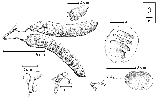 Fruit: A legume; unilocular; 0.8–20(–25) cm long; 0.5–2.5(–3.5) cm wide; 0.6–2 cm thick; length less than twice as long as width to 2–9 times longer than wide; with deciduous androecial sheath; with deciduous corolla; with deciduous calyx; without orifice formed by curving of fruit or fruit segments; straight to curved; not plicate; not twisted; asymmetrical; elliptic, or oblong, or circular; not inflated; compressed to terete; without beak; long tapered at apex to tapered at apex; aligned with longitudinal axis of fruit; short tapered at base to rounded at base; aligned with longitudinal axis of fruit; with the apex and base uniform in texture; fleshy, or drupaceous (ligneous with age); seed chambers externally invisible; margin not constricted; margin without sulcus; margin plain; wing(s) absent; substipitate to nonstipitate; with the stipe 1–3 mm long; indehiscent. Replum invisible. Epicarp dull to glossy; monochrome; dull reddish to dark brown, or tan; with surface texture uniform; glabrous to pubescent and indurate; with hairs erect; with simple hairs; without spines; smooth, or not smooth; with elevated features, or recessed features; veined, or not veined; reticulately veined; not tuberculate; pitted; not exfoliating; without cracks; without embedded tissue, much thicker than epicarp, running from base to apex. Mesocarp usually present (absent in B. rouxevillei); surface not veined; 1-layered (?); without balsamic vesicles; with fibers, or without fibers; without reniform canals; solid (fleshy when fresh); ligneous. Endocarp present; visible; dull to glossy; opaque; monochrome; brown; without adhering pieces of testa; subseptate to nonseptate (separating into 1-seeded subligneous segments or cocci in B. rouxevillei); not exfoliating; remaining fused to mesocarp and epicarp; entire. Seed(s) 1–2(–4), or 5–25; length transverse to fruit length; neither overlapping nor touching; in 1 series. Funiculus 0.1–1 mm long; of 1 length only; thick ("flared and lobed"); straight. Aril absent.