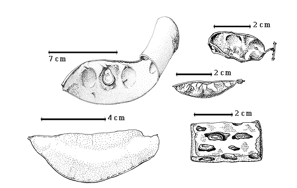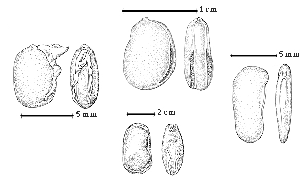 Seed: 4–35 mm long; 3–35 mm wide; 2.1–13 mm thick; not overgrown; angular, or not angular; symmetrical, or asymmetrical; ovate to circular, or oblong, or quadrangular, or rectangular, or irregular (with or without hilar notch); compressed to flattened; with surface smooth; without visible radicle and cotyledon lobes; without hilar sinus; without umbo on seed faces; without medial ridge on each face. Cuticle not exfoliating; not inflated; not wrinkled. Testa present; without pieces of adhering epicarp; not adhering to endocarp; free from endocarp; glossy to dull; not modified by a bloom; colored; monochrome; brown to purplish or blackish brown to black; glabrous; smooth, or not smooth; with elevated features, or recessed features (rarely with tan pits along outer margin of face); rugose (and with or without fan arising from hilar regions or center of face); pitted with small separate pits; osseous to chartaceous. Pleurogram absent. Pseudopleurogram absent. Fracture lines present, or absent; inconspicuously to conspicuously concentric. Rim absent. Wing(s) absent. Raphe not visible. Hilum present; visible, or fully concealed; concealed by funicular remnant; without faboid split; larger than punctiform; 1.3–50 mm long (from base to end of arm and arms of equal or unequal length and occupying up to 7/8 of seed circumference; reddish tan); with angular outline; V-shaped; subapical to radicle tip; not within corona, halo, or rim. Lens discernible, or not discernible (?); 0.2–1.5 mm long; with margins straight, or curved; oblong, or irregular; elliptic; not in groove of raphe; mounded; dissimilar color from testa (?); ?; black, or red, or tan; not within corona, halo, or rim. Endosperm present, or absent; not pluglike and not resembling tip of radicle; adnate to testa. Cotyledons smooth; both outer faces convex; both the same thickness; both more or less of equal length; not folded; margin entire 180 degrees from base of radicle; similar at apex; partially concealing radicle; with lobes; with lobes overlapping, or not touching; with basal groin formed by lobes; with the interface division terminating at base of radicle; without margins recessed; inner face flat; glabrous on inner face. Embryonic axis straight; parallel to length of seed to oblique to length of seed (slightly); without a joint evident between the radicle and the cotyledons. Radicle differentiated from cotyledon; centered between cotyledons. Plumule rudimentary; glabrous.