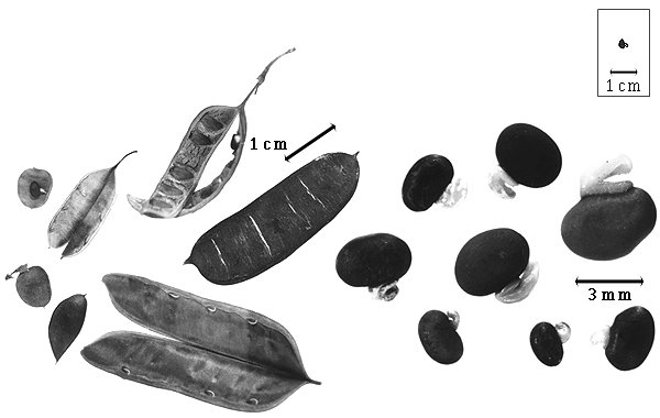 Fruit: A legume; unilocular; 1.2–1.7 cm long; 0.7–1 cm wide; 0.15–0.25 cm thick; 2–9 times longer than wide; with deciduous androecial sheath; with deciduous corolla; with deciduous calyx; without orifice formed by curving of fruit or fruit segments; straight; not plicate; not twisted; asymmetrical, or symmetrical; oblong, or circular, or linear; with 1 straight and 1 curved suture, or both sutures parallelly curved; widest near middle or D-shaped; not inflated; flattened; without beak, or with beak; straight; with solid beak the same color and texture as fruit; short tapered at apex to rounded at apex; aligned with longitudinal axis of fruit; short tapered at base; aligned with longitudinal axis of fruit; with the apex and base uniform in texture; coriaceous to chartaceous; seed chambers externally visible, or invisible; seed chambers with the raised seed chambers not torulose; margin not constricted; margin without sulcus; margin plain, or embellished; margin with thickened sutural areas (thick or keeled especially upper suture); wing(s) absent; stipitate, or substipitate, or nonstipitate; with the stipe to 5 mm long; with all layers dehiscing; splitting along suture(s). Dehiscence of valves along both sutures; apical and down (assumed); active, or passive; with valves revolute. Replum invisible. Epicarp dull; monochrome; black, or brown, or gray; with surface texture uniform; glabrous, or pubescent and indurate; with hairs erect; villous; with pubescence golden, or gray; with pubescence uniformly distributed; with simple hairs; pliable; with hair bases plain; without spines; not smooth; with elevated features; veined, or not veined; not tuberculate; striate (at right angles to fruit length); not exfoliating; without cracks; without embedded tissue, much thicker than epicarp, running from base to apex. Mesocarp present; thin; surface not veined; 1-layered; without balsamic vesicles; without fibers; without reniform canals; solid; coriaceous. Endocarp present; visible; dull; opaque; monochrome; brown; spongy (corklike); without adhering pieces of testa; septate, or nonseptate; with septa thicker than paper, firm; with septa eglandular; chartaceous; not exfoliating; remaining fused to mesocarp and epicarp; without wings; entire. Seed(s) 1–2(–3); length transverse to fruit length; neither overlapping nor touching; in 1 series. Funiculus of 1 length only; straight. Aril present; fleshy; when fleshy flat from apex to near base; entire; covering less than 1/2 of seed; tan.