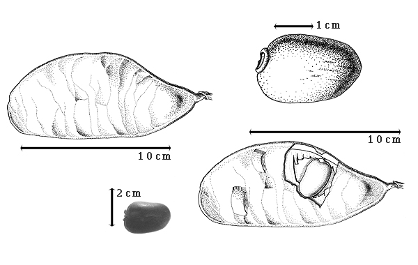 Fruit: A legume; unilocular; 13 cm long; 6.5 cm wide; 0.7–1.2 cm thick; length less than twice as long as width; with deciduous androecial sheath; with deciduous corolla; with deciduous calyx; without orifice formed by curving of fruit or fruit segments; straight; not plicate; not twisted; asymmetrical; elliptic, or oblong; not inflated; flattened; without beak; tapered at apex; oblique with longitudinal axis of fruit; tapered at base; aligned with longitudinal axis of fruit; with the apex and base uniform in texture; ligneous; seed chambers externally invisible; margin not constricted; margin without sulcus; margin plain; wing(s) absent; substipitate; with all layers dehiscing; splitting along suture(s). Dehiscence of valves passive. Replum invisible. Epicarp dull; multicolored; mottled; reddish and yellowish brown; with surface texture uniform; glabrous; eglandular; without spines; not smooth; with elevated features; veined; transversely veined relative to fruit length; not tuberculate; exfoliating; without cracks; without embedded tissue, much thicker than epicarp, running from base to apex. Mesocarp present; surface not veined; 2-layered; without balsamic vesicles; with fibers; without reniform canals; with fibers over solid layer; ligneous. Endocarp present; visible; dull; opaque; monochrome; white; cobwebby ("white pubescent"); without adhering pieces of testa; nonseptate; not exfoliating; remaining fused to mesocarp and epicarp; entire. Seed(s) length transverse to fruit length; neither overlapping nor touching; in 1 series. Funiculus 0.1–2 mm long; of 1 length only; thick; straight. Aril present (dark reddish brown); fleshy; when fleshy marginal hilar; entire; covering less than 1/2 of seed.
