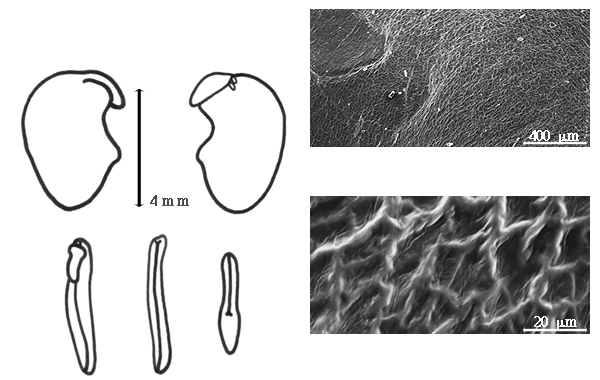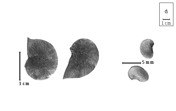 Seed: 3.5–5 mm long; 2–3.5 mm wide; 0.5–0.6 mm thick; not overgrown; not angular; asymmetrical; reniform; flattened; with surface smooth; with visible radicle and cotyledon lobes; without external groove between radicle and cotyledon lobes; without hilar sinus; with umbo on seed faces; without medial ridge on each face. Cuticle not exfoliating; not inflated; not wrinkled. Testa present; without pieces of adhering epicarp; not adhering to endocarp; free from endocarp; dull; not modified by a bloom; colored; monochrome; reddish brown; glabrous; smooth; chartaceous. Pleurogram absent. Pseudopleurogram absent. Fracture lines absent. Rim absent. Wing(s) absent. Raphe visible; from lens to base of seed and terminating; not bifurcating; darker than testa; dark reddish brown; raised. Hilum present; fully concealed; concealed by funicular remnant; without faboid split; punctiform, or larger than punctiform; 0.2–0.5 mm long; with straight outline; oblong; between cotyledon and radicle lobe; flush; within halo; halo darker than testa. Lens not discernible. Endosperm absent. Cotyledons smooth; both outer faces convex; both the same thickness; both more or less of equal length; not folded; margin entire 180 degrees from base of radicle; similar at apex; partially concealing radicle; notched at radicle; with lobes; with lobes not touching; without basal groin formed by lobes; with the interface division terminating at base of radicle; without margins recessed; reddish tan; inner face flat; glabrous on inner face. Embryonic axis deflexed; oblique to length of seed; without a joint evident between the radicle and the cotyledons. Radicle differentiated from cotyledon; linear; deflexed and parallel to cotyledon length; centered between cotyledons; less than 1/2 length of cotyledons. Plumule moderately developed; glabrous.